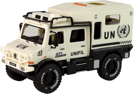 Šis robustais apvidus auto elegantā bēšā krāsā sniedz daudz darbības un jautrības. Nospiežot kādu no trim pogām uz jumta, iedegas priekšējās LED gaismas un atskan sirēnas skaņas, kas pastiprina reālistisku spēles pieredzi. Atveramās durvis veicina radošus stāstus un attīsta bērnu iztēli.