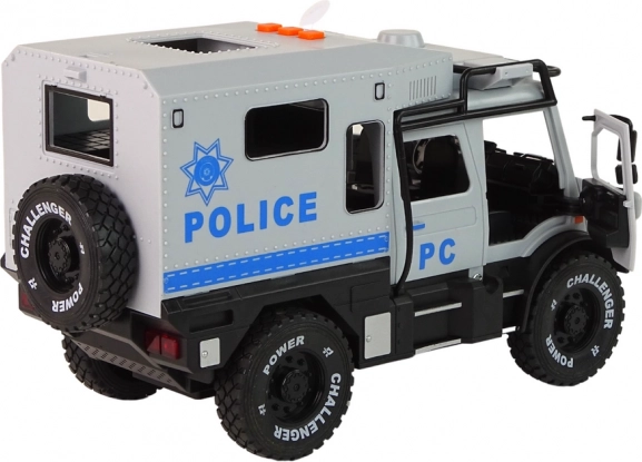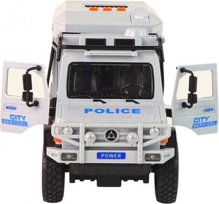 Pateicoties atveramām priekšējām durvīm, bērni var izpētīt auto salonu un veidot savus spēļu scenārijus. Skaņas un gaismas efekti piešķir vēl lielāku aizrautību! Priekšējās LED gaismas iedegas, nospiežot vienu no trim jumta pogām, savukārt trauksmes skaņas piešķir reālistisku noskaņu.
