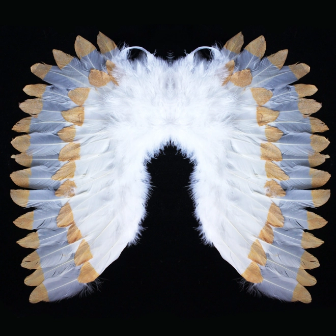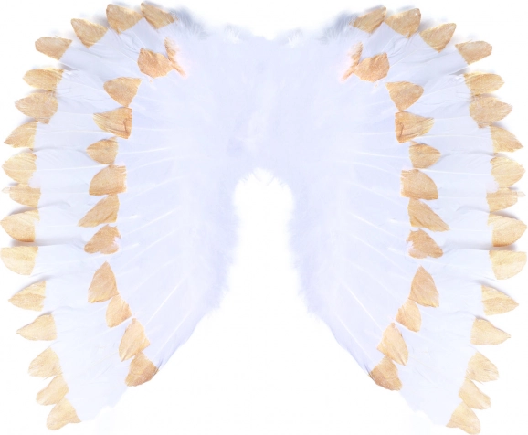 Eleganti eņģeļu spārni ar sniegbaltām spalvām un zeltainiem mirdzumiem lieliski papildinās eņģeļa kostīmu. Pateicoties izmēram apmēram 67 × 46 cm, tie sniedz izteiksmīgu efektu un ērtu nēsāšanu karnevālos, Svētā Mikoļā dienā un tematikas ballītēs.