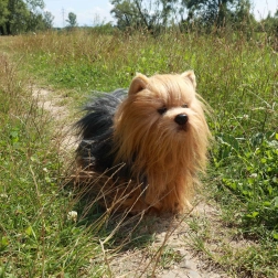 Gara, zīdaini maiga spalva, spīdīgas acis un autentiska krāsu gamma veido pārliecinoši reālistisku jorkšīras terjera izskatu.