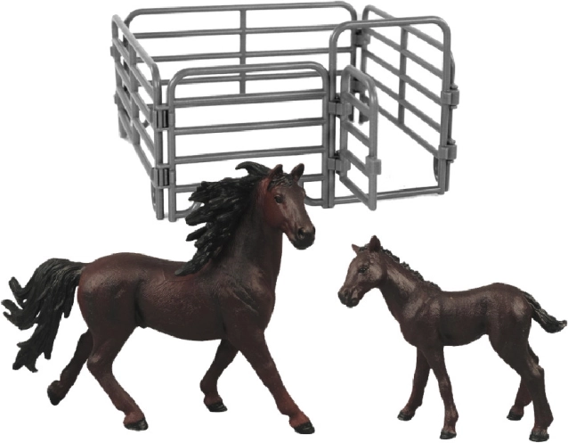Bagātiniet savu rotaļlietu kolekciju ar šo skaisto zirgu komplektu ar aploku. Zirga un kumeļa figūras izskatās reālistiski un ar savu izstrādājumu iepriecina visas vecuma grupas. Iepakojumā iekļauts: