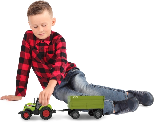 Atklājiet realistisku lauku saimniecības spēli ar kompaktu traktoru un piekabi, kas ir ideāli piemērota bērnu rokām. Piekabi var viegli atvienot un atvērt, tāpēc “kravas” pārvadāšana ir tīrais nieks. Pateicoties brīvgaitei, traktoru ir viegli vadīt un tas gludi brauc pa līdzenām virsmām.