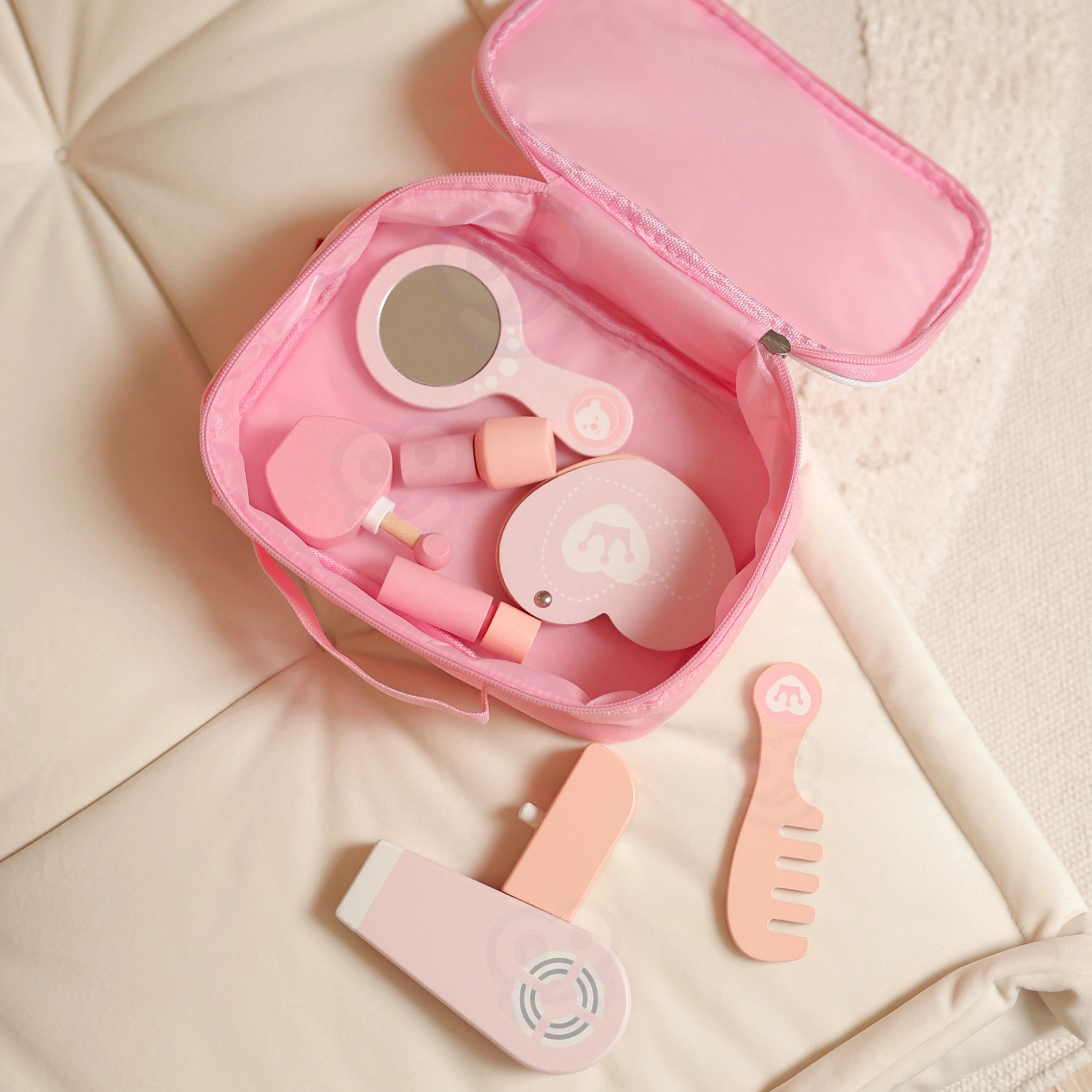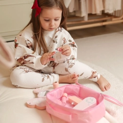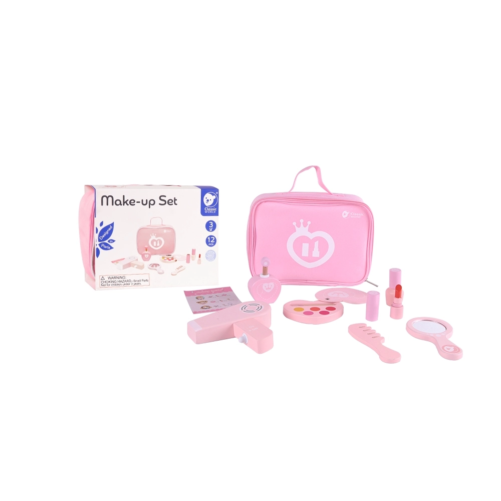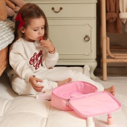 Šis bērnu kosmētikas komplekts mīlīgā rozā somiņā piedāvā līdz pat 12 rūpīgi izstrādātus koka aksesuārus. Bērni var “grimēties”, ķemmēt un “žāvēt” matus, atdarinot pieaugušos drošā un iztēli rosinošā veidā. Pateicoties kompaktajiem izmēriem, komplekts ir ideāli piemērots gan mājās, gan ceļā.