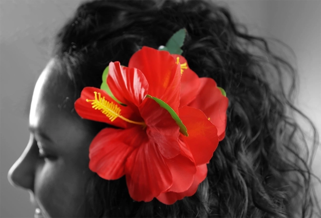 Šī ziedu matu sprādze piešķir jūsu stilam eksotiku. Ar tās koši sarkanajiem ziediem un zaļajām lapiņām jūs pārvērtīsieties par jebkura pasākuma karalieni — vai tā būtu pludmales ballīte, havajiešu vakars vai svinības pie baseina.