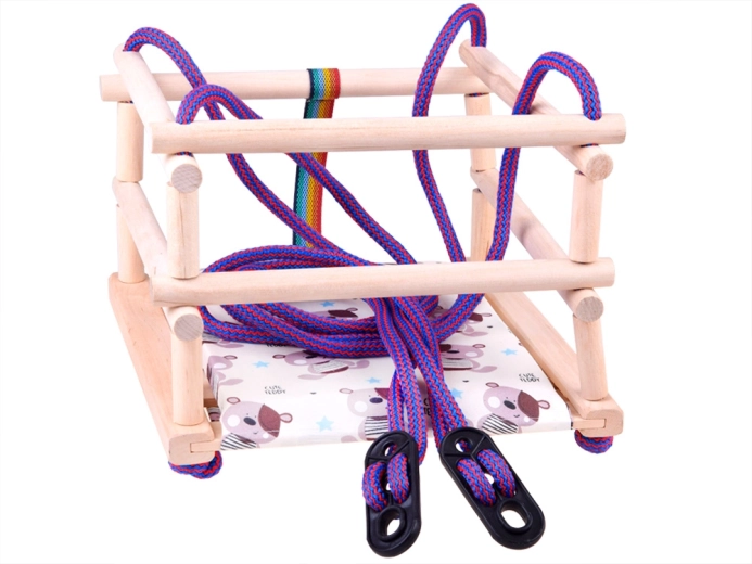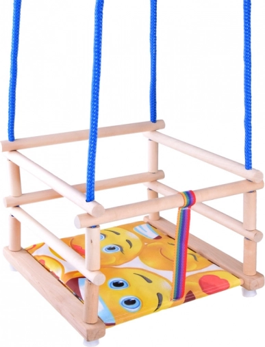 Šīs krāsainās koka šūpoles izgatavotas no kvalitatīva dižskābarža koka un apstrādātas ar ekoloģisku ūdens bāzes laku augstākai izturībai un ilgmūžībai. Komplektā ir mīksts sēdeklis papildu komfortam un drošības josta, kas pasargā bērnu no noslīdēšanas.