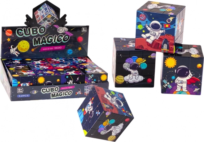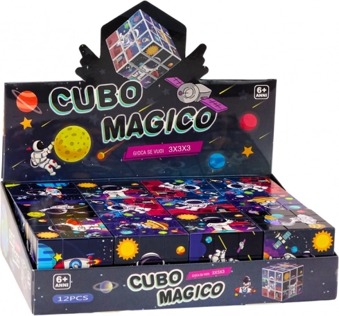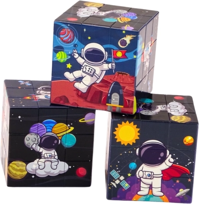 Burvju kubs ir izstrādāts košās krāsās ar draudzīgām ilustrācijām, lai tas būtu aizraujošs un jautrs mazajiem astronomijas cienītājiem. Bērnu uzdevums ir salikt attēlu ar tādiem motīviem kā astronauti un planētas, kas veicina viņu radošumu.