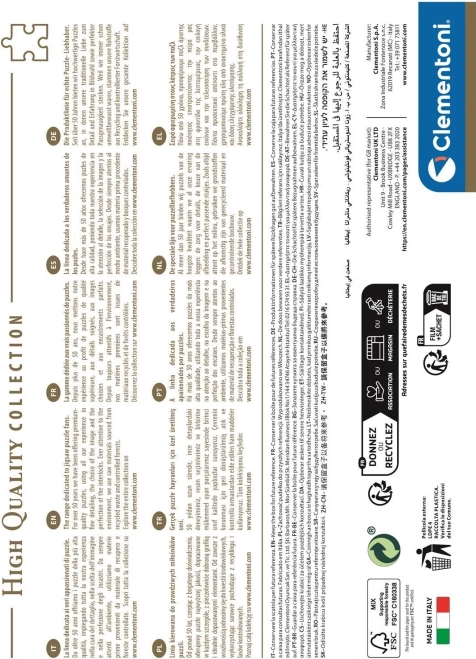 Atklājiet eleganto Parīzes motīvu – Eifeļa tornis, pilsētas ikonas un stilīga krāsu gamma padara šo puzli par lielisku izvēli pilsētas ainavu cienītājiem. Zīmols CLEMENTONI ir pazīstams ar precīzu druku, izturīgu izpildījumu un perfekti piegulošiem gabaliem.