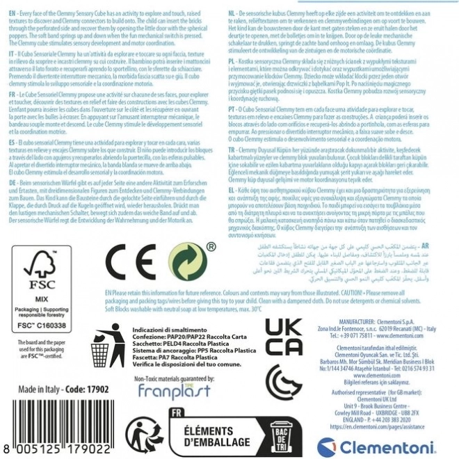 Iepakojumā iekļauti četri mīksti Clemmy klucīši, kurus var viegli ievietot un izņemt no kuba caur perforētu segmentu vai sakraut virspusē. Kubs ir mīksts, drošs un pilnībā mazgājams, ideāli – līdz 30°C ar neitrālām ziepēm.
