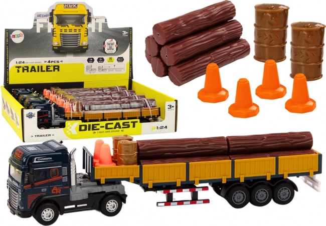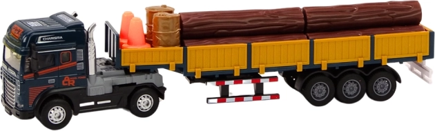 Reālistisks kravas auto modelis mērogā 1:24 piedāvā zilu kabīni, atvienojamu puspiekabi ar noņemamām bortēm un kravu koka baļķu veidā. Vēl aizraujošākai spēlei ir gaismas un skaņas efekti (motora iedarbināšana, atpakaļgaitas signāls) un brīvgaita/uzvilkšana braukšanai. Komplektā ietilpst arī pārvietojami konusi un divi mucas iekraušanas un “darbu zonas” norobežošanas scenārijiem. Sertifikācija CE, atbilst EN71, piemērots no 3 gadu vecuma.