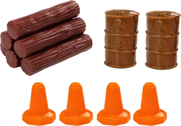 Puspiekabi var vienkārši atvienot, tāpēc bērni var spēlēties atsevišķi ar vilcēju un piekabi. Komplektā ir 4 satiksmes konusi, 2 mucas un krava koka baļķu veidā, kas paplašina spēles iespējas un veicina iztēli un sīko motoriku.