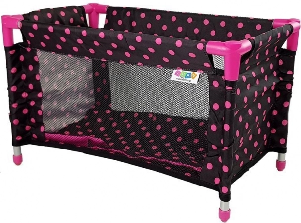 Stilīga leļļu gultiņa Alice melni‑rozā dizainā ar punktiņiem iepriecinās ikvienu mazo māmiņu. Tai ir caurspīdīgas sieta malas ērtai lelles uzraudzībai, izturīga alumīnija konstrukcija ar rozā plastmasas savienotājiem, un tā tiek piegādāta ar spilventiņu, segu un praktisku pārnēsājamo somu. Piemērota lellēm līdz 40 cm.