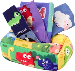 Šī mīkstā sensorā kastīte ir ideāla pirmajai izpētei. Bērni var vilkt ārā un atkal ievietot 3 čaukstošas kabatiņas un 6 krāsainus audumus ar atšķirīgām tekstūrām, kas motivē aktīvai spēlei un satvēriena trenēšanai. Priedīgās ilustrācijas un spilgtās krāsas piesaista uzmanību un veicina vizuālo uztveri.