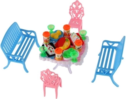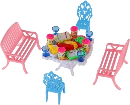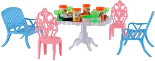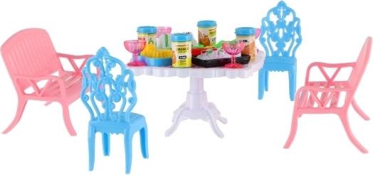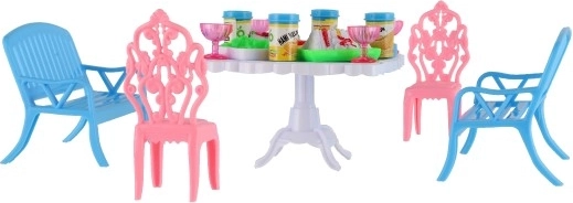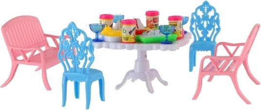 Palutiniet savas lelles ar stilīgām maltītēm, izmantojot šo ēdamistabas mēbeļu komplektu, kurā ietilpst 2 solini, 2 krēsli un galds, papildināti ar 13 realistiskiem piederumiem (glāzītes, bundžiņas, šķīvji un paplāte). Košās krāsas un kvalitatīvs plastmasas materiāls attīsta iztēli un sīko motoriku – ideāli leļļu namiņam.