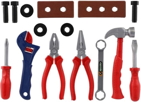 Komplektā ir tipiski instrumenti, piemēram, āmurs, skrūvgriezis, knaibles un atslēga, kā arī uzgriežņi un skrūves skrūvēšanas treniņam. Pateicoties praktiskajam maisiņam, novākšana un pārnēsāšana ir vienkārša – lieliski piemērots arī kā dāvana.
