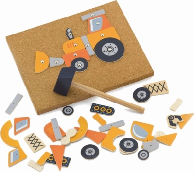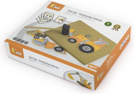 Radošā VIGA korķa naglojamā spēle ar celtniecības transportlīdzekļiem aizraus mazos būvētājus no 3 gadu vecuma. Koka formas ar caurumiem ar sīknaglām un āmuriņu tiek piestiprinātas pie dēlīša – bērni attīsta sīkās motorikas prasmes, loģisko domāšanu, radošumu un koncentrēšanos. Komplektā ir 45 detaļas, korķa pamatne, āmuriņš, sīknagliņas un paraugu kartītes ar celtniecības tehniku.