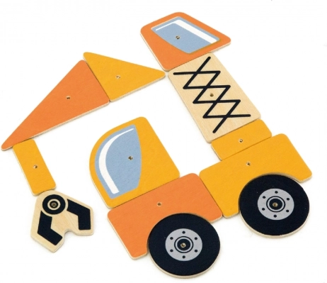 Atklājiet jautru un izglītojošu spēli Montessori garā. Bērni var atveidot celtniecības transportlīdzekļu paraugus vai veidot pašu idejas. Detaļām ir noapaļotas malas un iepriekš izurbti caurumi, tāpēc tās ir viegli un droši piestiprināt pie korķa pamatnes.