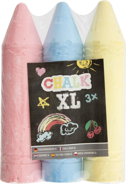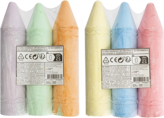 Komplekts ar krāsainām XL krītiņām, 19 cm garas, divās krāsu variantēs. Ideāli piemērotas radošai zīmēšanai uz dažādām virsmām.