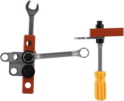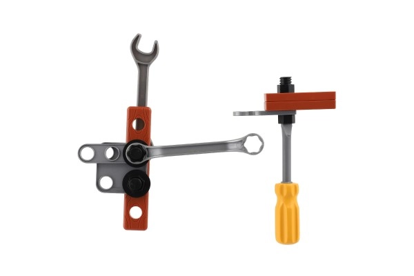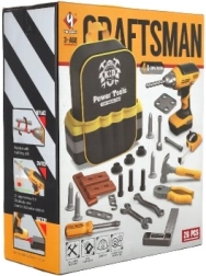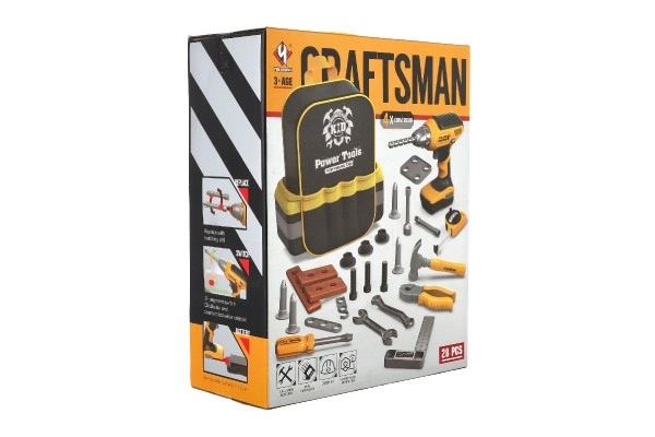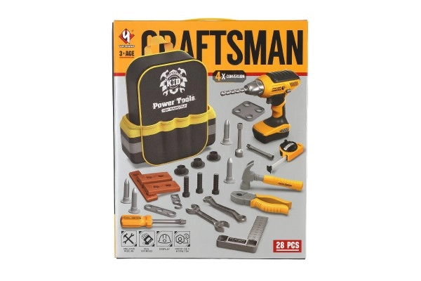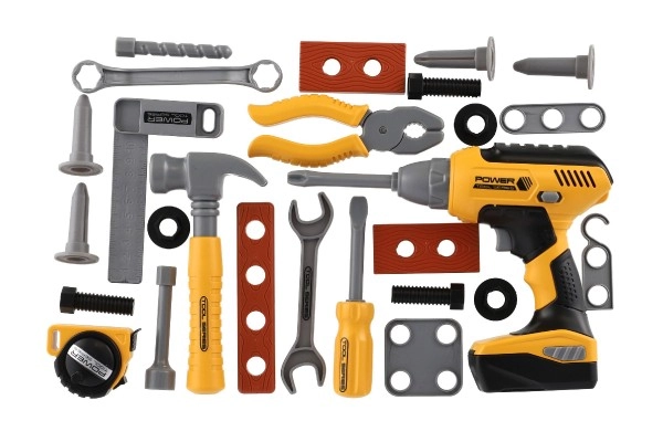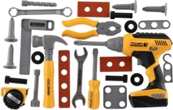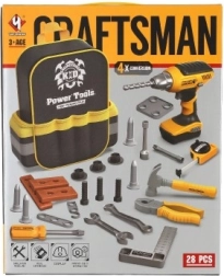 Komplektā ir 28 instrumentu vienības, tostarp akumulatora urbjmašīna, kas atdarina īstus darba rīkus jautrai un izglītojošai spēlei.