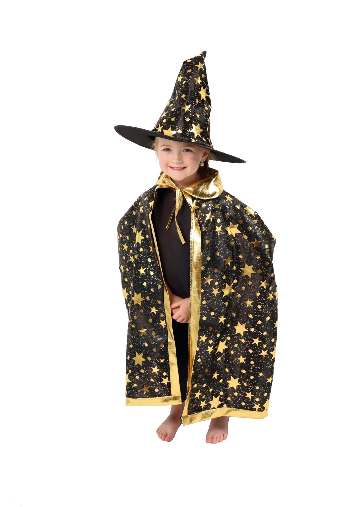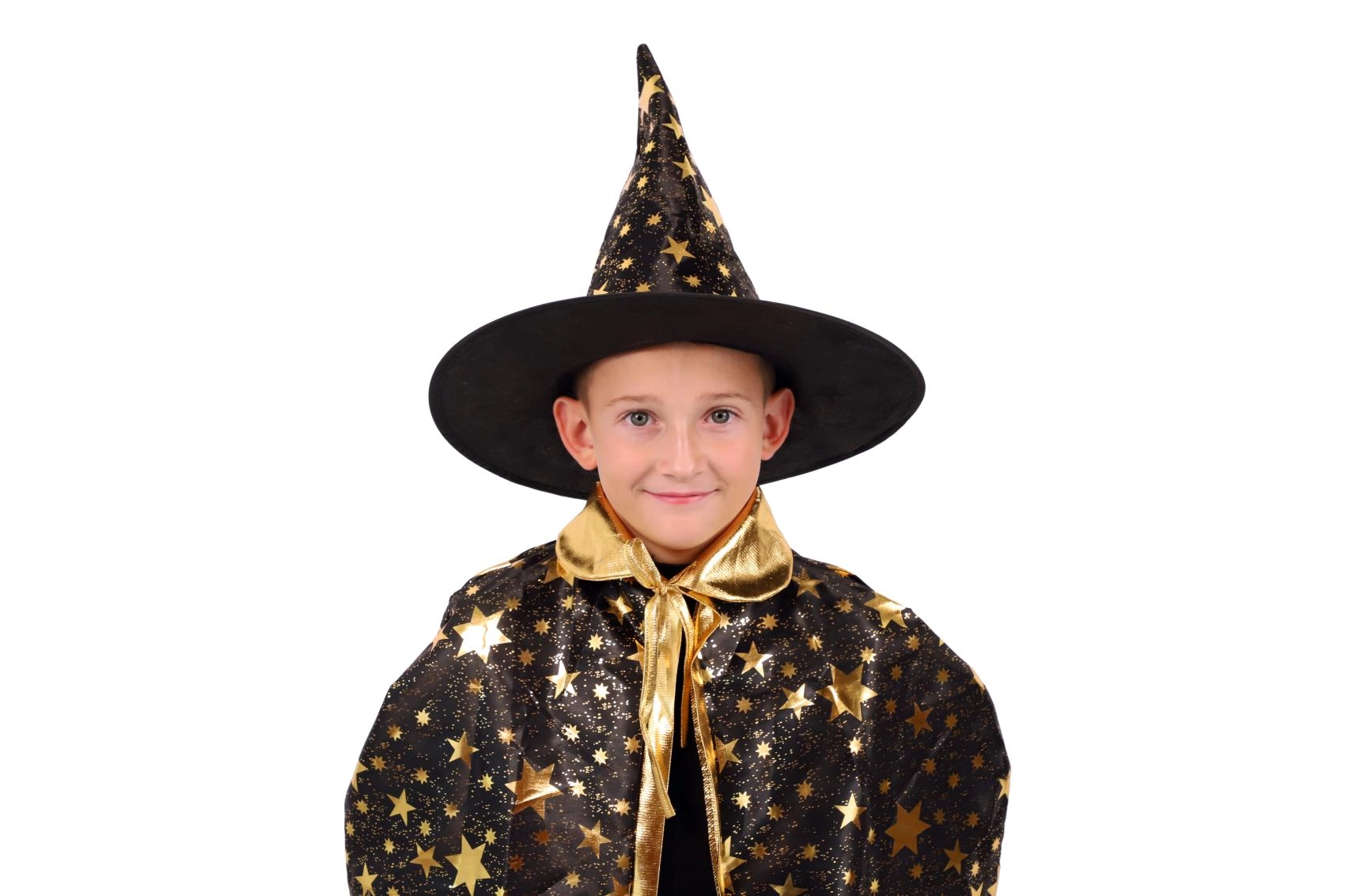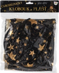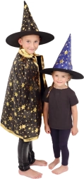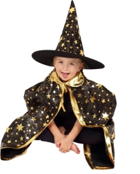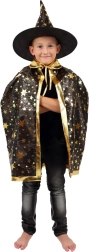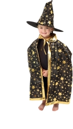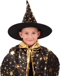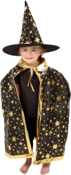Pārveidojiet savu bērnu par mazu burvi. Šis melni‑zeltais komplekts ar zvaigžņu apdruku ietver košu burvju cepuri un saskaņotu apmetni, kas lieliski der bērnu karnevāliem, masku ballēm un Helovīna svinībām. Pateicoties viegliem materiāliem, to ir ērti valkāt, un tie nodrošina brīvu kustību spēlēs un uzstāšanās laikā.
