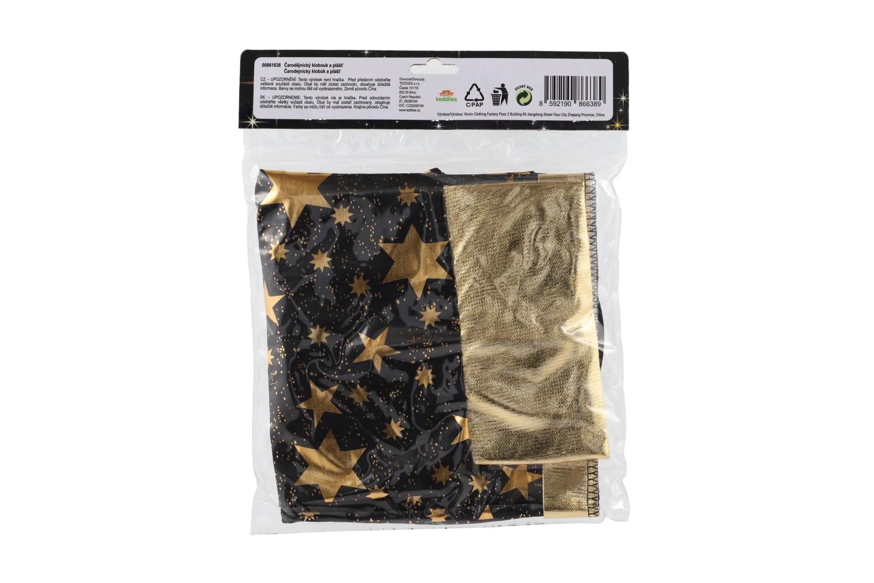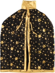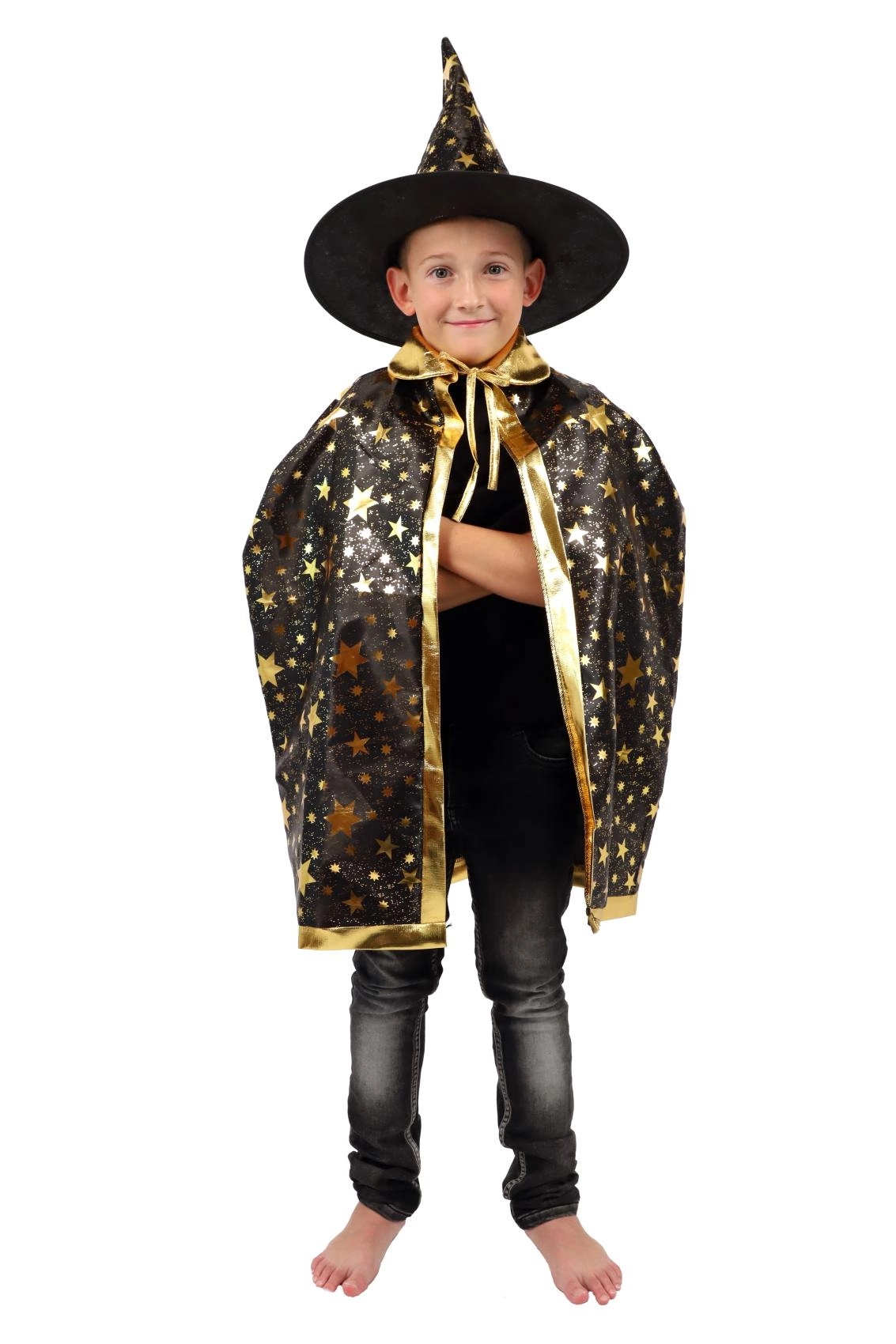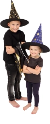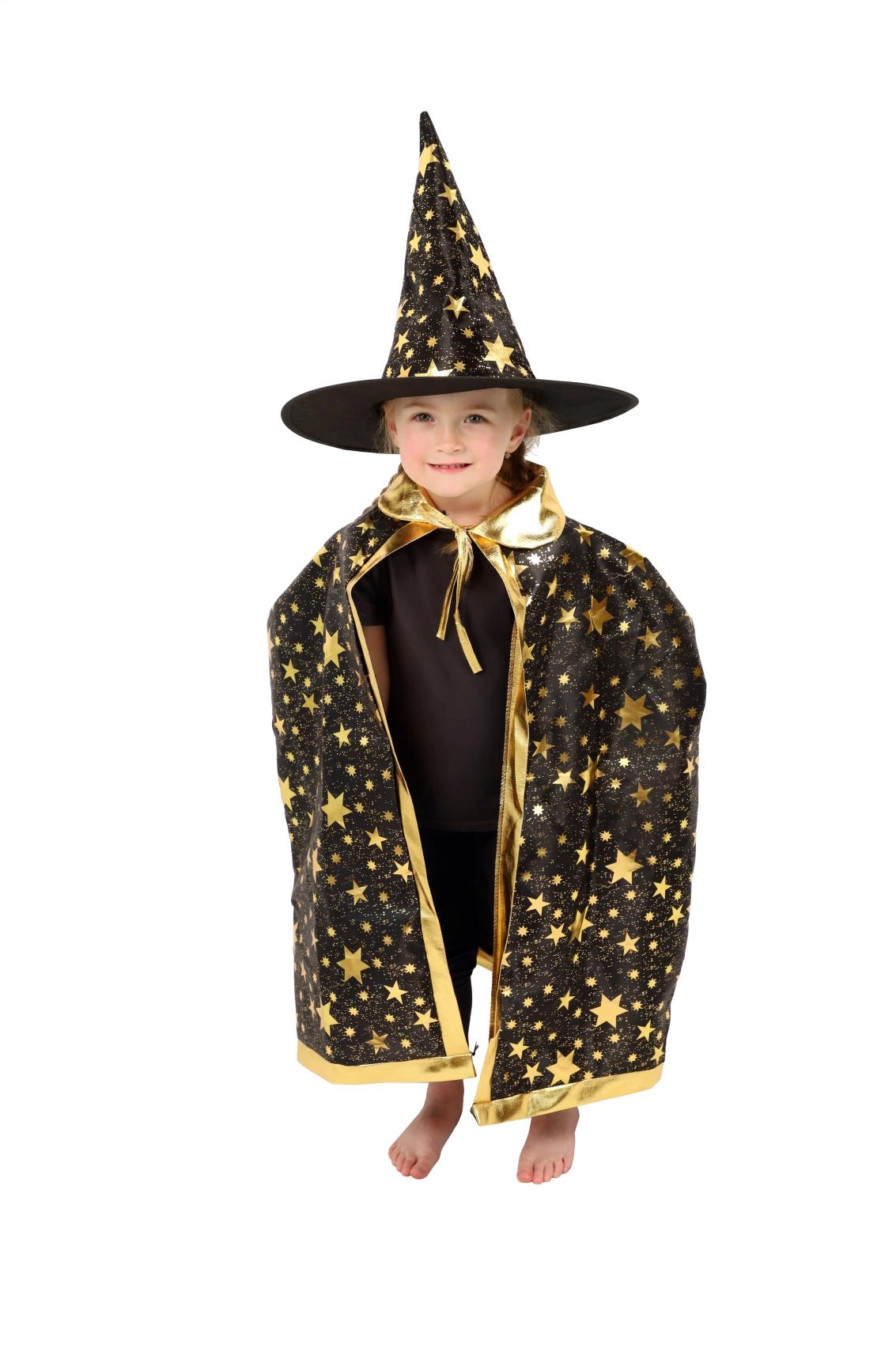 Pārveidojiet savu bērnu par mazu burvi. Šis melni‑zeltais komplekts ar zvaigžņu apdruku ietver košu burvju cepuri un saskaņotu apmetni, kas lieliski der bērnu karnevāliem, masku ballēm un Helovīna svinībām. Pateicoties viegliem materiāliem, to ir ērti valkāt, un tie nodrošina brīvu kustību spēlēs un uzstāšanās laikā.