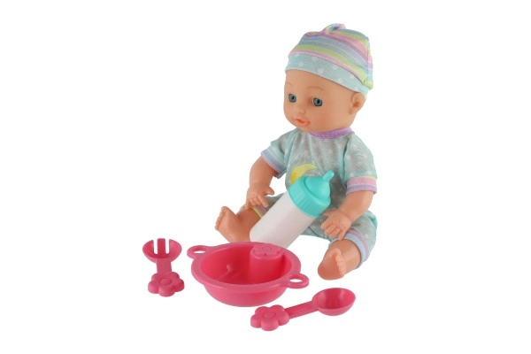 Iepakojumā ir bļodiņa, tējkarote, dakšiņa un krāsaina pudelīte, ar kuru bērni var vingrināt rūpes par mazuli un barošanas imitāciju.