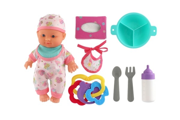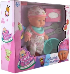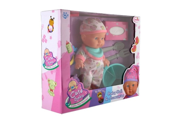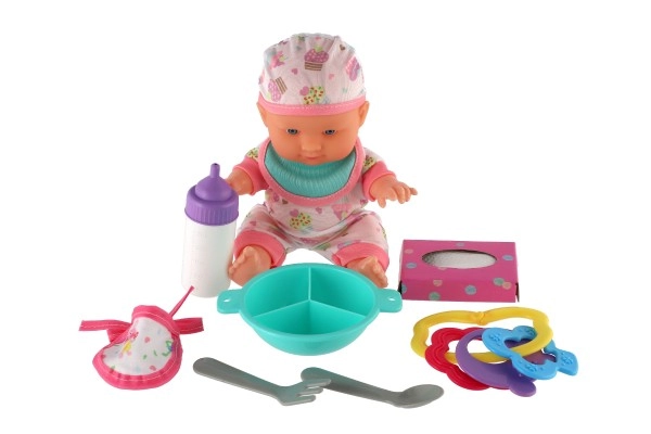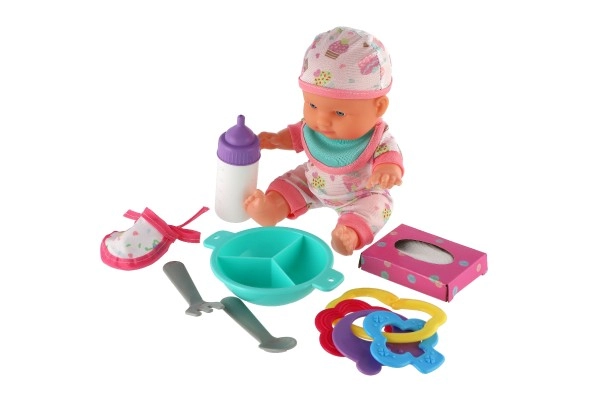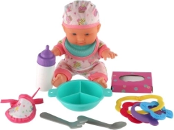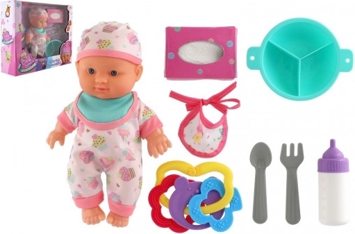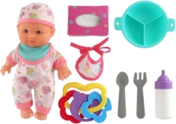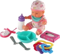 Iepakojumā iekļauta pudelīte, grabulis, mitrās salvetes un ēdināšanas komplekts mazuļiem, kas veicina realistisku spēli un attīsta motoriskās prasmes un sociālās lomas.