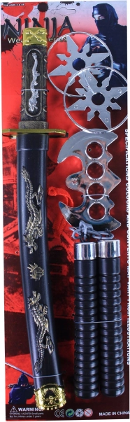 Ar šo nindzjas rotaļlietu komplektu ikviens mazais cīnītājs var iegrimst kaujas mākslu pasaulē. Komplektā iekļauts katanas zobens ar maksti, rotāts ar detalizētiem ornamentiem, kā arī citas rotaļlietas, piemēram, metamās zvaigznītes un nunčaki, lai pilnvērtīgi izspēlētu cīnītāja lomu.