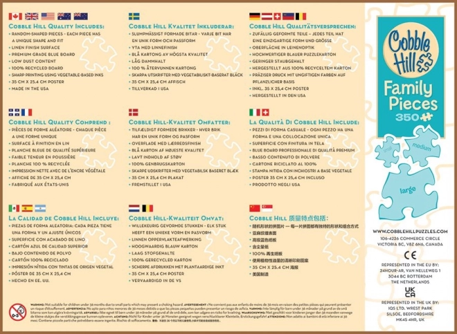 Unikālais COBBLE HILL izkārtojums nekopē klasisko režģi – gabaliņi ir neparastās formās, un stūri vai malas ne vienmēr ir vienā līnijā. Tas palielina gan izklaidi, gan grūtības pakāpi un sniedz apmierinājumu, pabeidzot puzli. Iekļauta arī praktiska parauglapa 31,6 × 22,9 cm ērtākai orientācijai.
