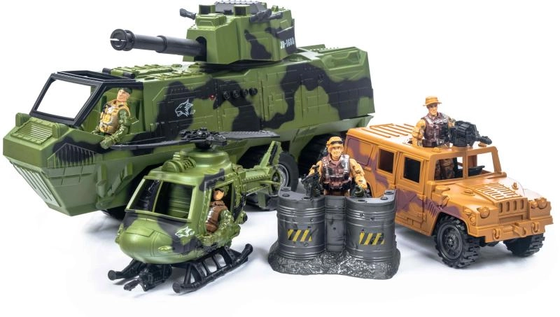 Komplektā ir bruņumašīna, helikopters un džips – ideāla kombinācija vienību pārvadāšanai, gaisa izlūkošanai un ātriem pārvietojumiem.