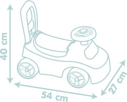 Stūre ar taurīti piešķir papildu izklaidi, savukārt sēdeklis ar glabātuvi paslēps mazus dārgumus. Priekšējie un aizmugurējie pretapgāšanās izvirzījumi paaugstina drošību braukšanas un apstāšanās laikā. Ideāls palīgs staigāšanas apguvei, līdzsvara un kājiņu stiprināšanai.