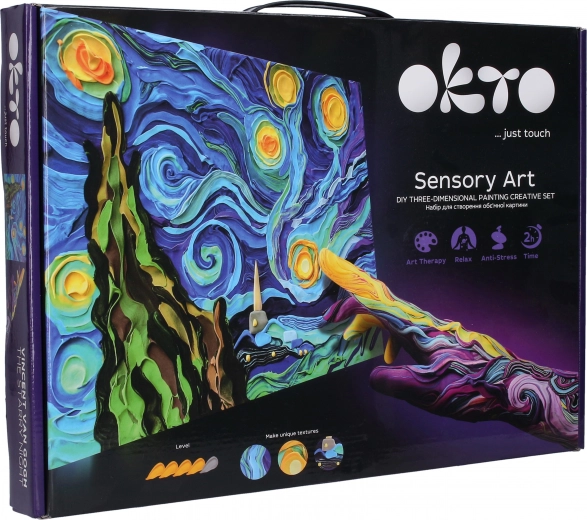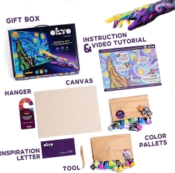Ienesiet savās mājās Vincenta van Goga Zvaigžņotās nakts gleznojuma burvību un izveidojiet savu unikālu darbu. Komplektā izmantota air clay (pašsacietējošā masa), kas piešķir rezultātam reljefu 3D efektu. Gleznošana ar pirkstiem ir intuitīva, aizraujoša un atslābinoša – piemērota gan bērniem, gan pieaugušajiem.