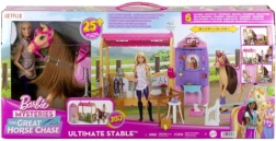 Atklājiet jāšanas pasaules burvību ar Barbie Ultimate Stable spēļu komplektu, kas iedvesmots no seriāla Barbie Mysteries: The Great Horse Chase. Vairāk nekā 25 detaļas un 6 spēļu zonas sniedz nebeidzamu radošu spēli – no barošanas un kopšanas līdz lēkšanas treniņiem un trofeju izstādīšanai. Zirgam ir gara krēpe un aste, kas piemērota ķemmēšanai un veidošanai, lelle saliec ceļus realistiskai jājienai, un staļļus var viegli salocīt uzglabāšanai.