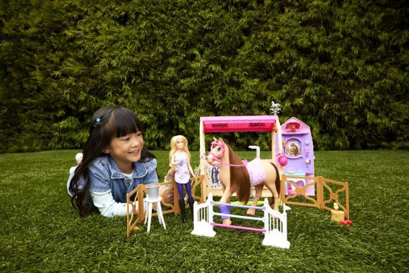 Izspēlējiet jāšanas dienu ar Barbie Ultimate Stable komplektu, kas piedāvā 360° spēļu vidi un daudz aksesuāru zirga kopšanai. Bērni var palīdzēt lellei Barbie ar barošanu stacijā, tīrīšanu un birstēšanu kopšanas zonā, trenēt lēkšanu pāri šķēršļiem un pēc tam lepni izstādīt lentes uz trofeju sienas. Ir arī rozā “plug and play” dārziņš, kā arī iespēja staļļus viegli salocīt ērtai uzglabāšanai.