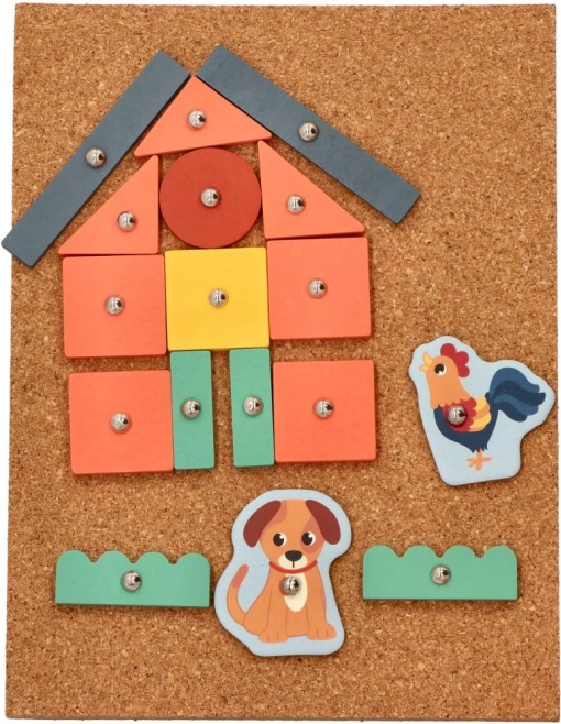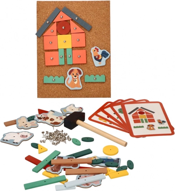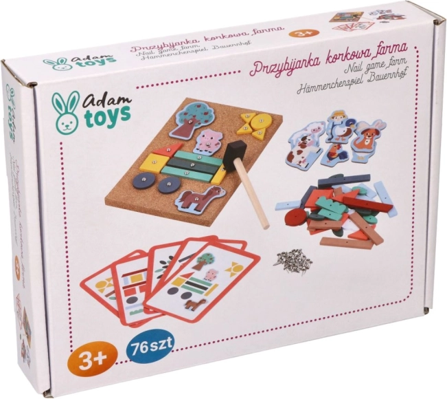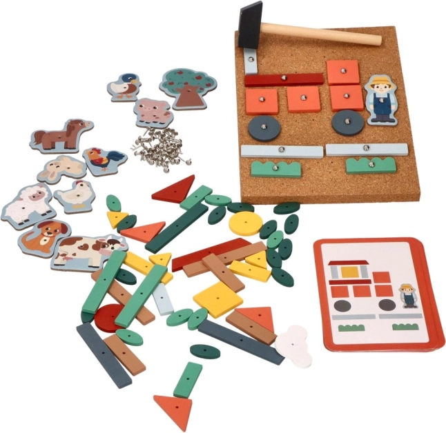 Korķa naglošanas spēle - Piedzīvojumi saimniecībā ir lielisks veids, kā iedrošināt bērnus veidot pašiem savus stāstus. Šis komplekts piedāvā daudz krāsainu koka figūru un saimniecības tēlu, kurus var piestiprināt pie korķa pamatnes ar mazām nagliņām un āmuriņu. Bērni, izmantojot instrukciju kartītes, var veidot dažādas ainas un attīstīt telpisko domāšanu.