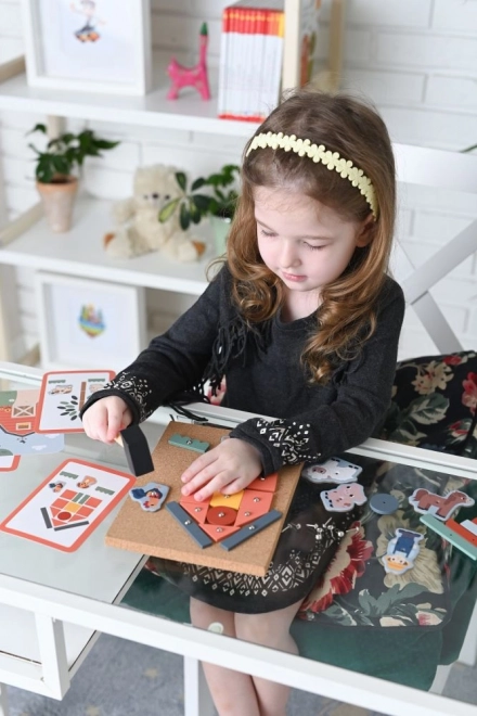Ar 76 detaļām, tostarp krāsainām ģeometriskām figūrām un saimniecības tēliem, bērni attīsta sīko motoriku un radošo domāšanu.