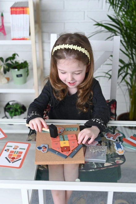 Rotaļlieta ir ideāli piemērota radošām un izglītojošām spēlēm, kurās bērni var izstrādāt un ar nagliņām piestiprināt figūras pie korķa pamatnes.