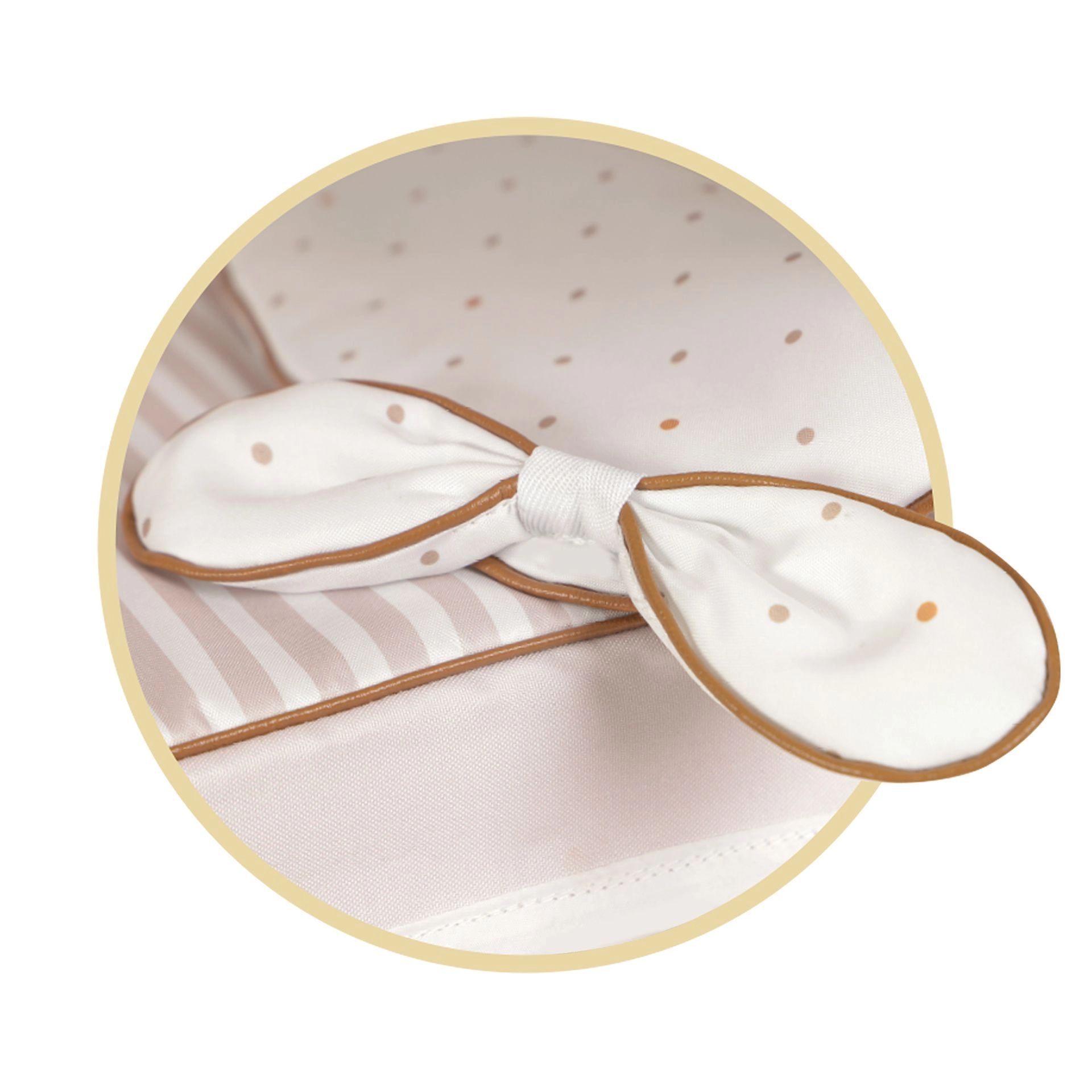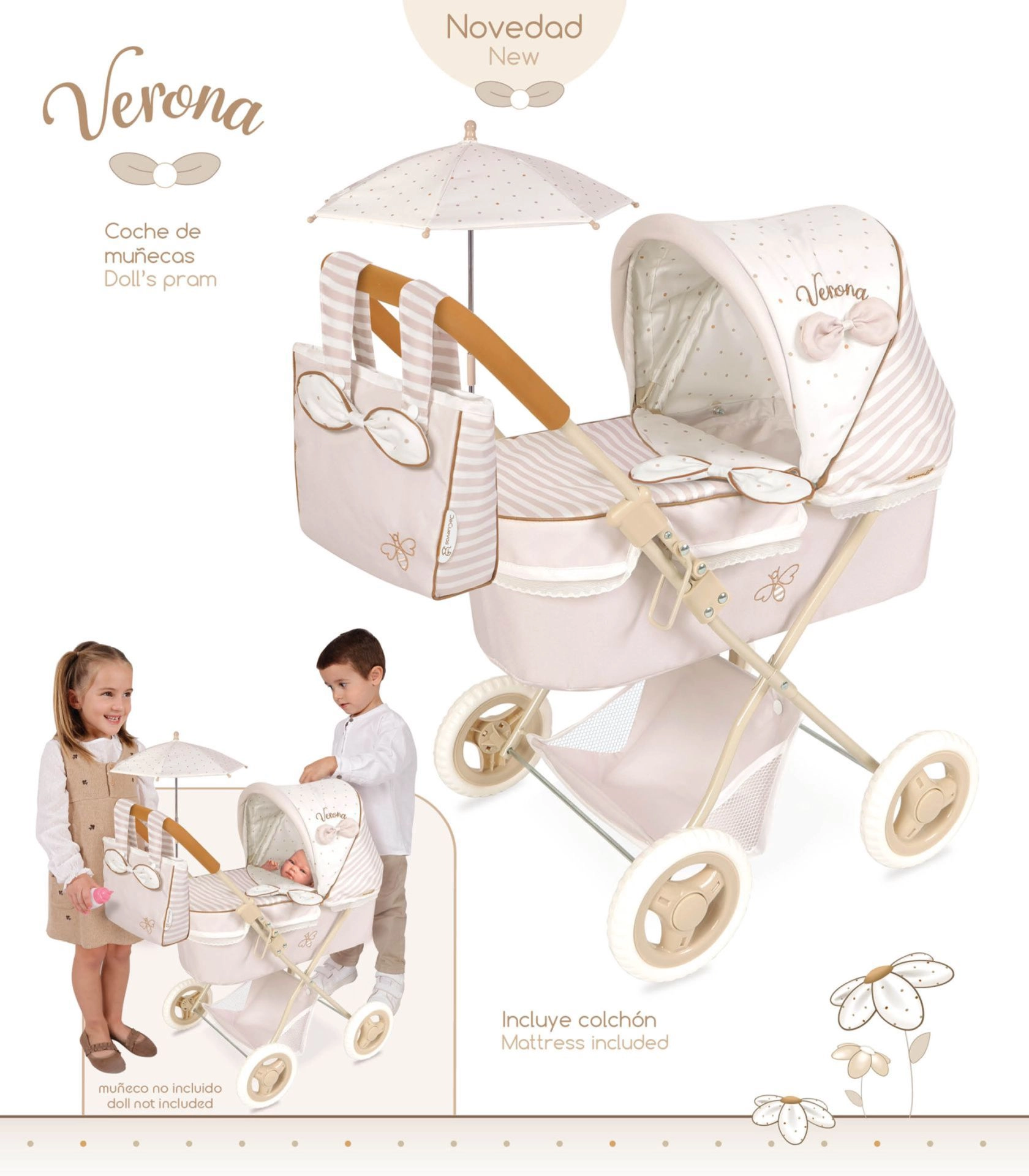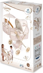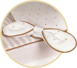 Pārdomāti leļļu ratiņi gaiši bēšā un baltā krāsu salikumā ar smalkiem punktiņiem un svītrām iepriecinās katru mazo māmiņu. Dabisko izskatu papildina mīlīgas bantītes un nelieli bišu izšuvumi. Pateicoties saliekamai konstrukcijai, ratiņus ir viegli pārnēsāt un glabāt.