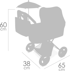 Komplektācijā ir praktisks saulessargs (Ø 42 cm), noņemama soma, kulbiņas pārsegs ar cilpiņām piestiprināšanai, matracis un apakšējais uzglabāšanas grozs. Stabils metāla rāmis, izturīgi riteņi un kvalitatīvs tekstils nodrošina ērtu un drošu spēlēšanos.