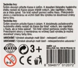 Plastmasas kazū ir lielisks veids, kā bērnus un iesācējus iepazīstināt ar mūzikas pasauli. Spēlēšana ir ārkārtīgi vienkārša – pūšanas vietā pietiek dūkt iemutī un kazū radīs raksturīgu dūcošu toni. Pateicoties kompaktajam 12 cm garumam, tas ērti ietilpst kabatā un vienmēr ir pa rokai.
