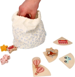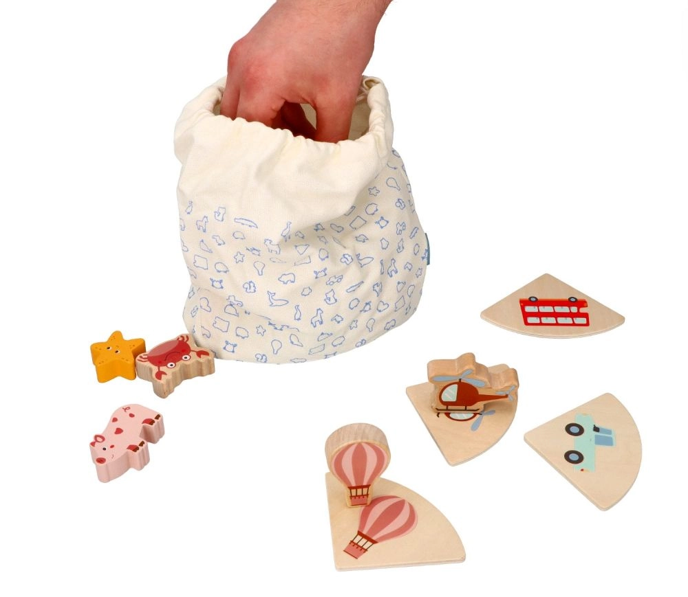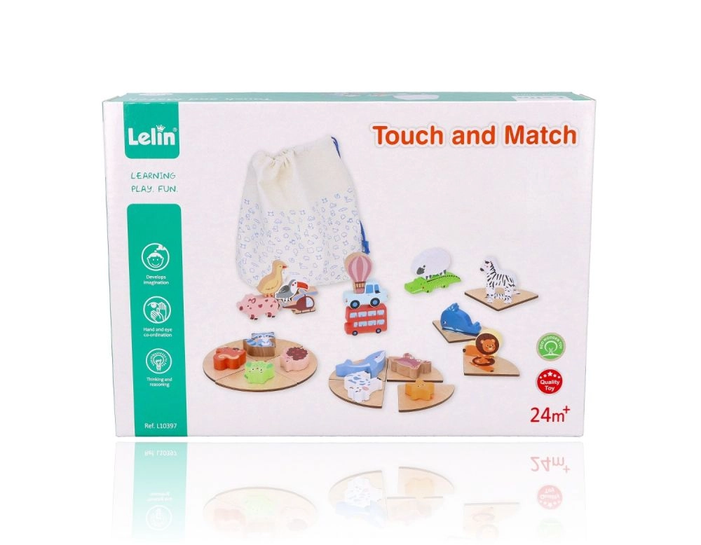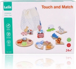 Šī “Touch & Match” tipa koka spēle no zīmola LELIN māca bērniem atpazīt formas un attēlus ar taustes palīdzību. Krāsainās koka detaļas ar dzīvnieku, transporta un priekšmetu motīviem tiek pārī savienotas ar atbilstošām pamatnēm, kamēr bērns maisiņā ar tausti meklē pareizo gabaliņu.