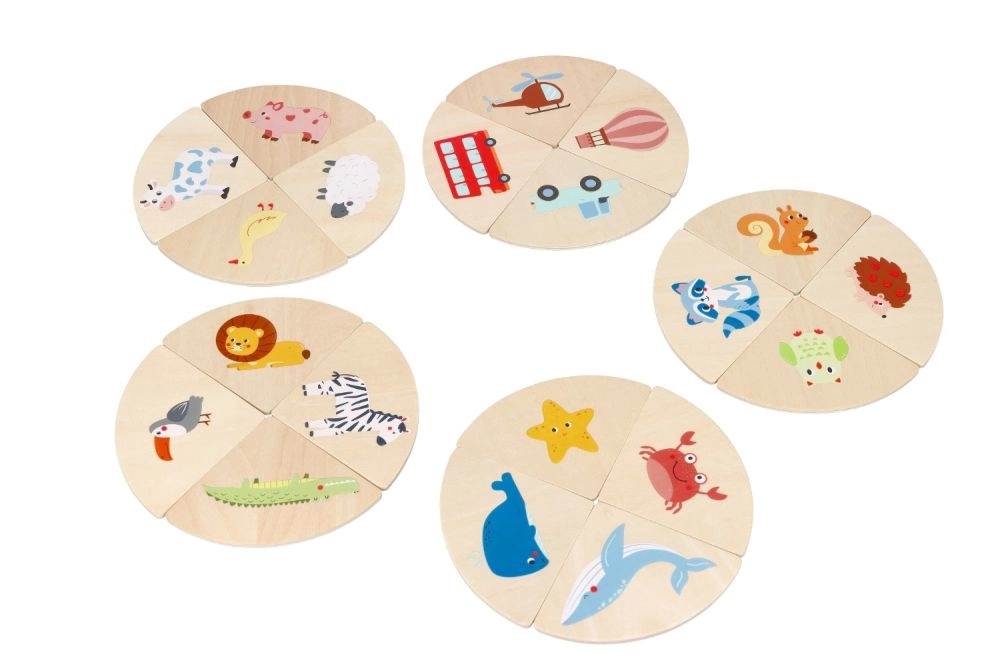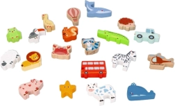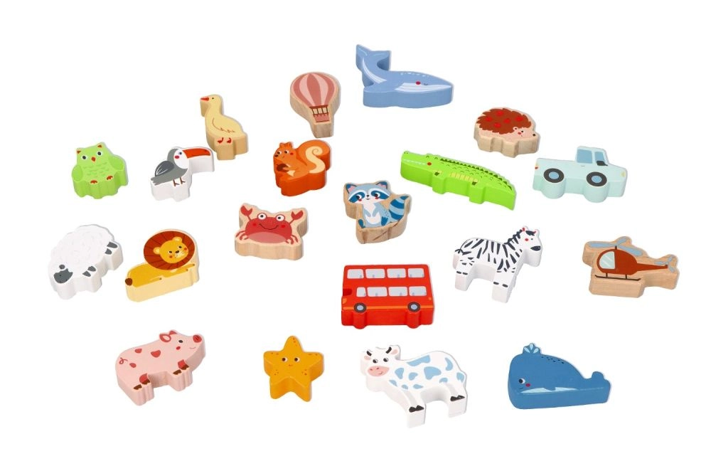 Izturīgi koka formas gabaliņi ar dzīvnieku, transportlīdzekļu un priekšmetu attēliem iedvesmo mācīties un brīvi spēlēties. Gludās malas ir drošas mazām rokām.