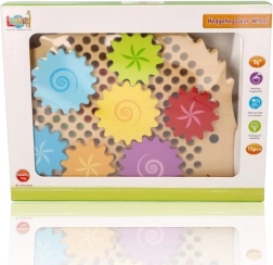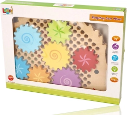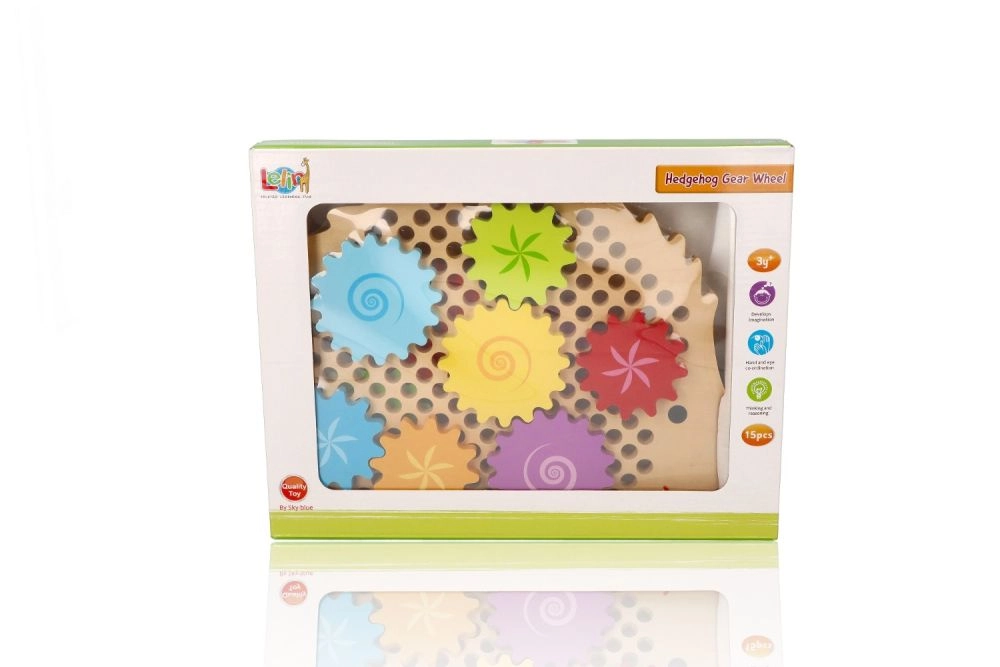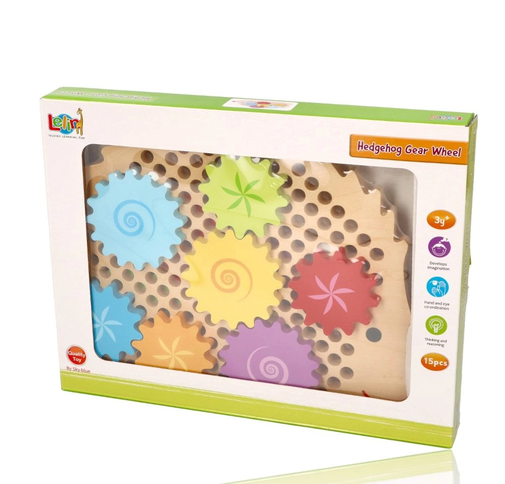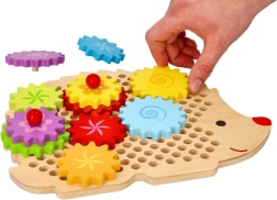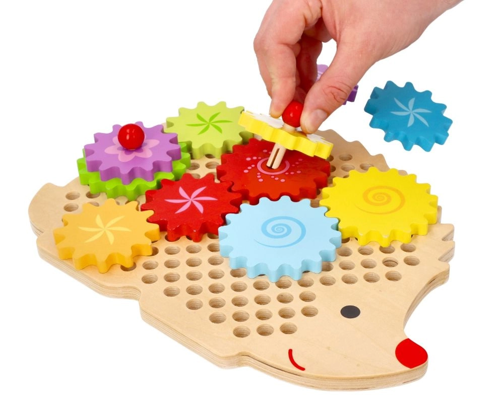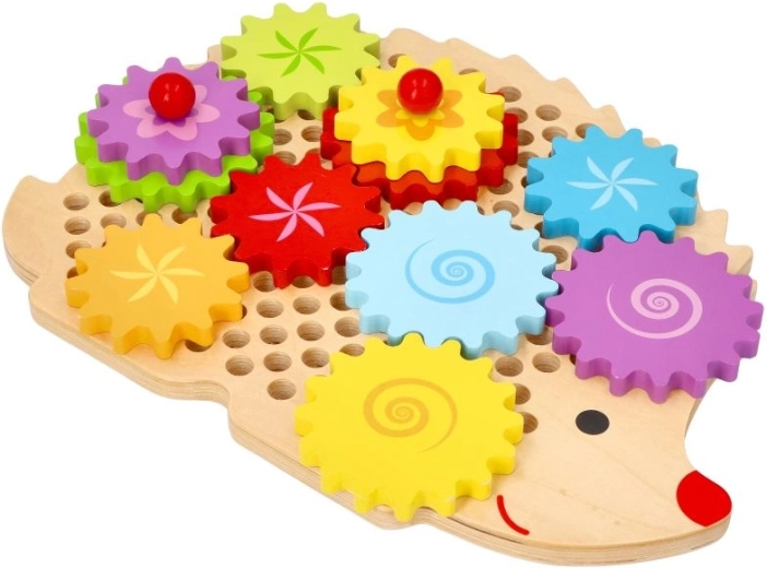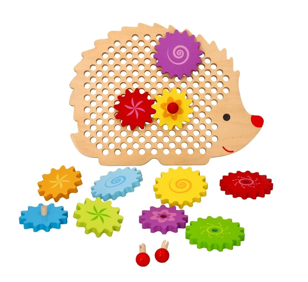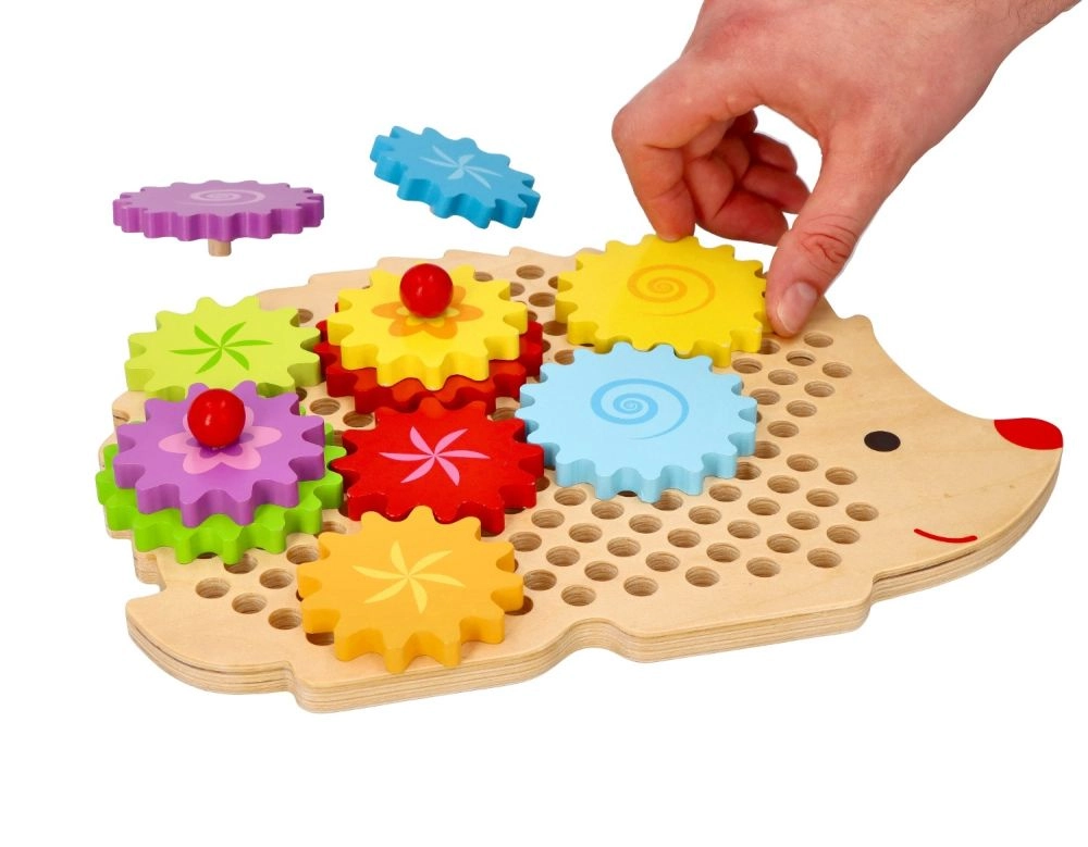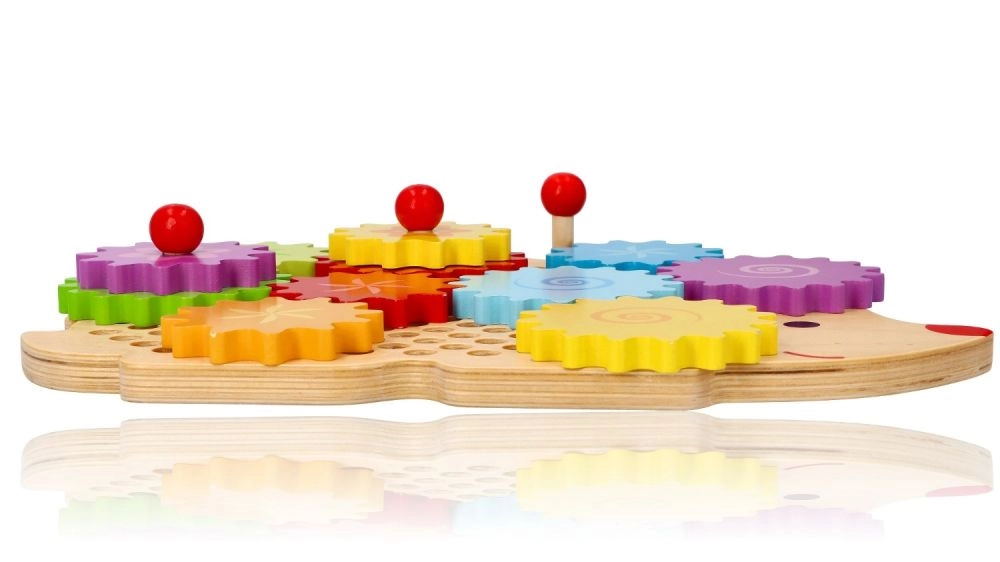 Koka puzle ezīša formā ar košiem zobratiem veicina agrīnu mācīšanos rotaļu ceļā. Bērni var novietot zobratus uz tapām, izmēģināt dažādas kombinācijas un vērot, kā visi riteņi sāk griezties. Tas stiprina loģisko domāšanu un dabiski skaidro cēloņsakarības principus.