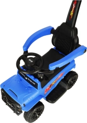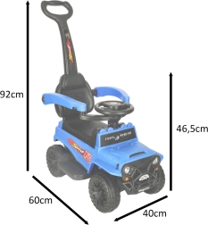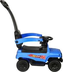 Zila bērnu braucamā mašīna bezceļa stilā apvieno izklaidi un drošību. Pateicoties vadotnes rokturim, aizsargbarjerām un atzveltnei, tā ir ideāli piemērota kopīgām pastaigām, savukārt gaismas un skaņu efekti veicina iztēli un braukšanas prieku.