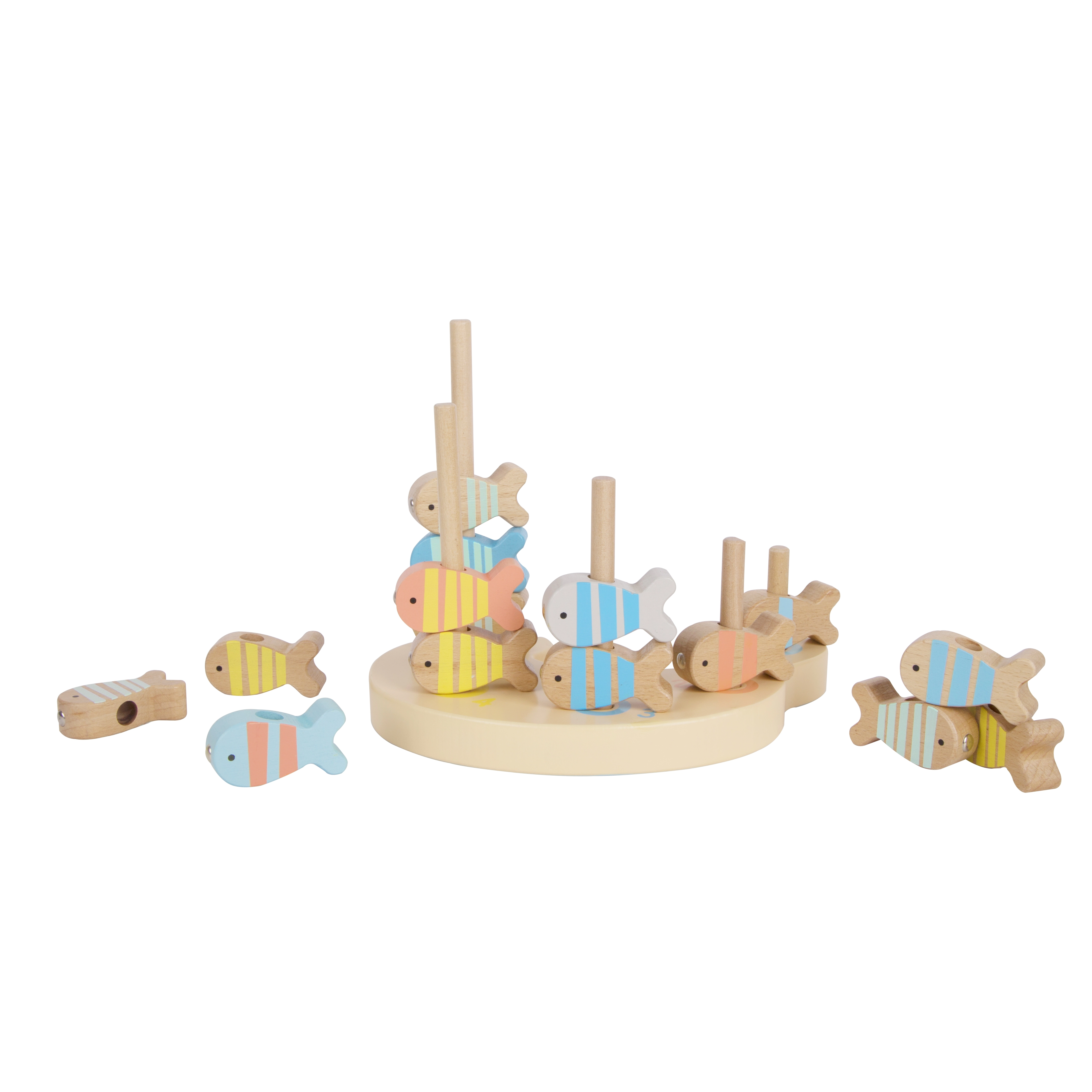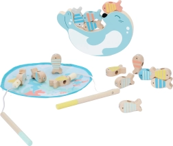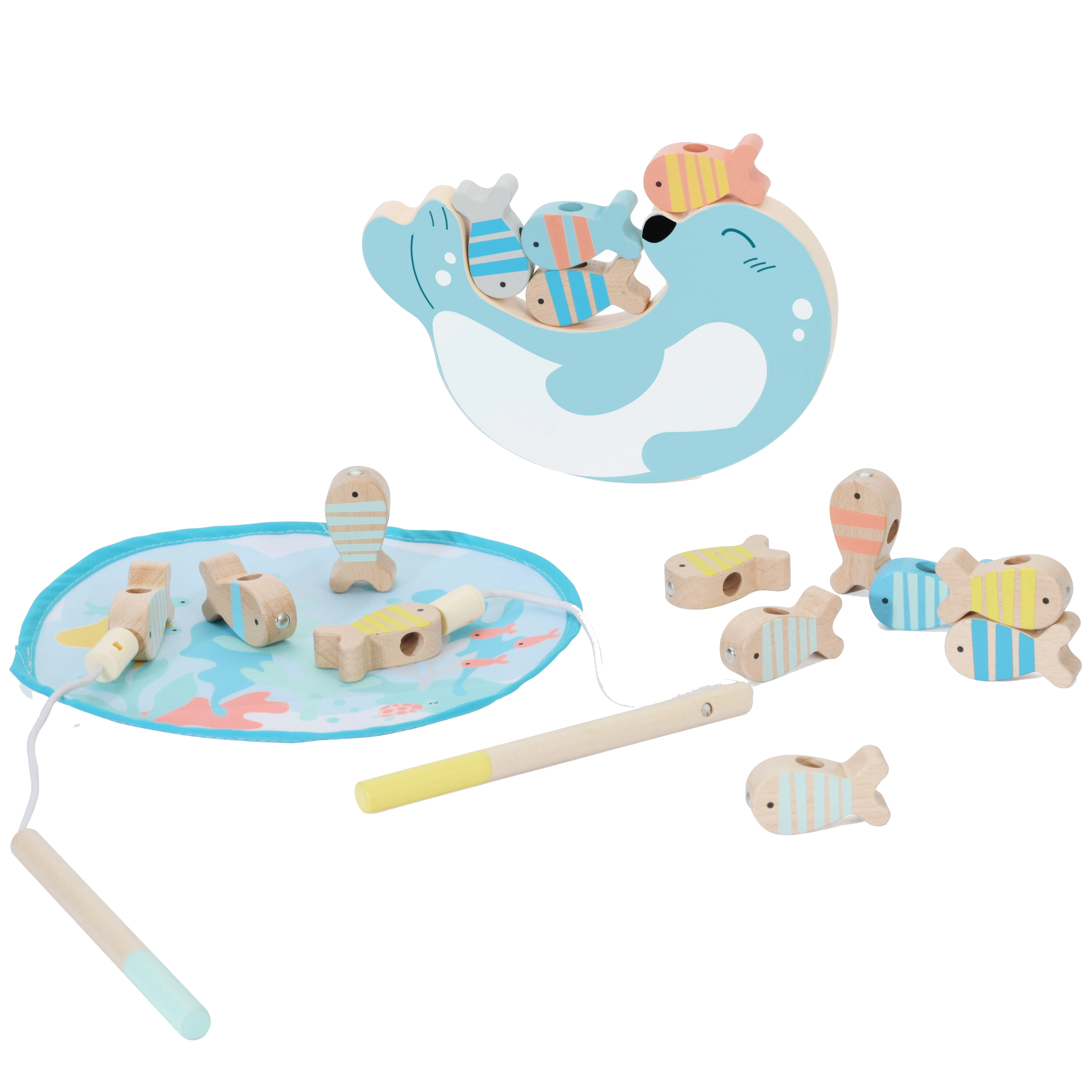 Šis koka komplekts sniedz bērniem no apmēram 3 gadu vecuma daudzpusīgu mācīšanos rotaļājoties. Pateicoties magnētiskajām makšķerēm, bērni trenē precizitāti un pacietību, balansēšanas daļa pilnveido līdzsvaru un veiklību, bet šķirošanas dēlītis ar cipariem palīdz apgūt krāsas un skaitīšanu.