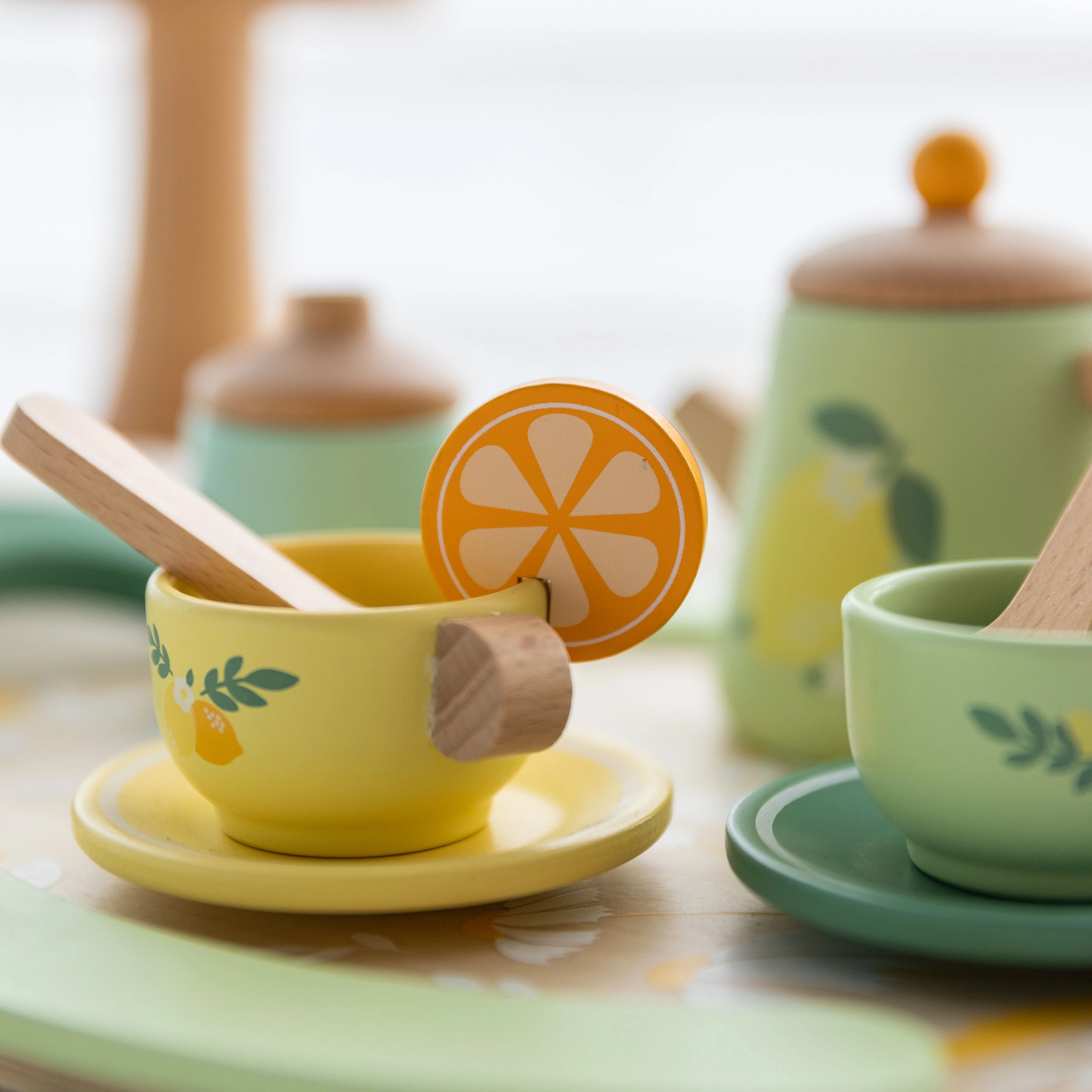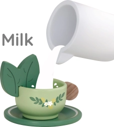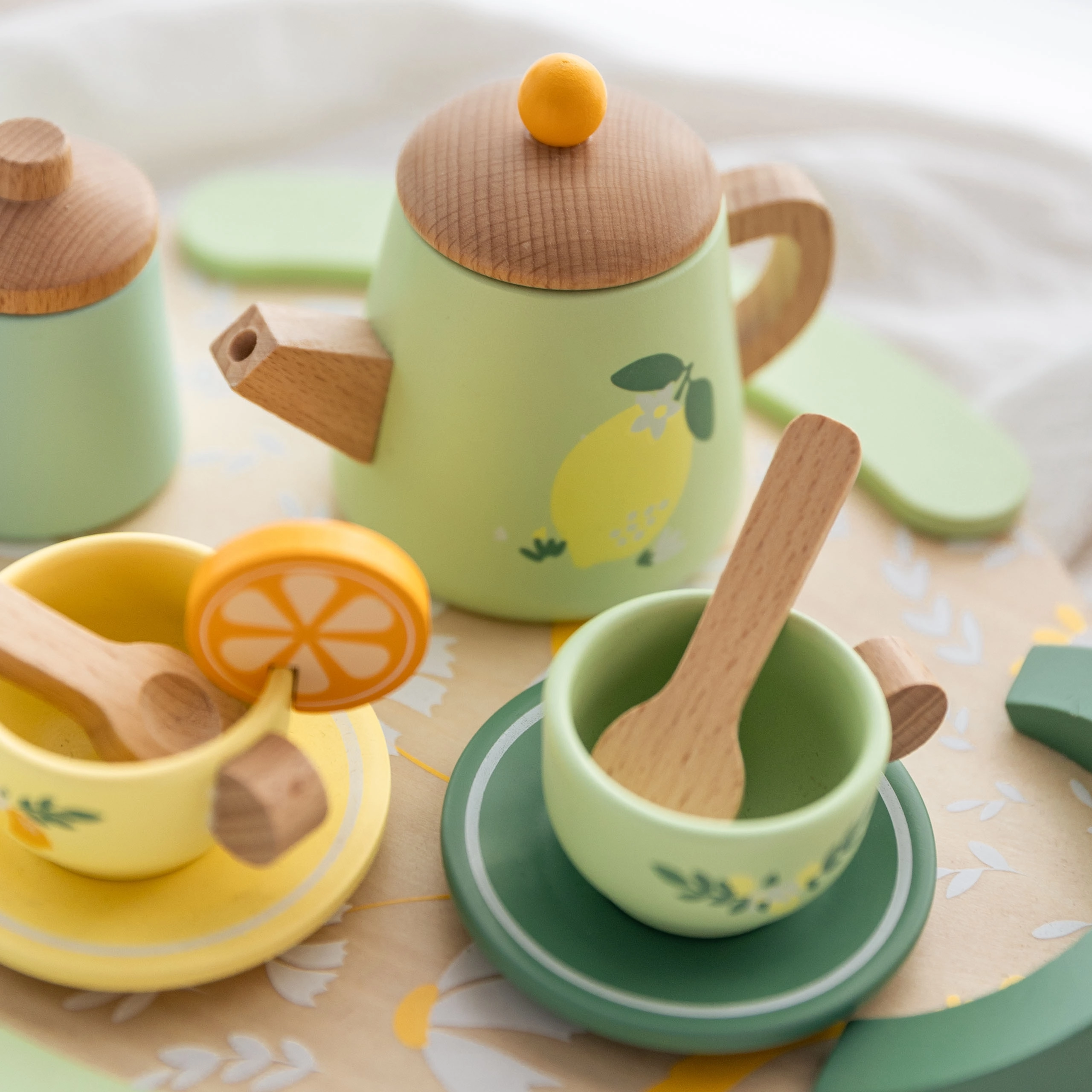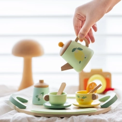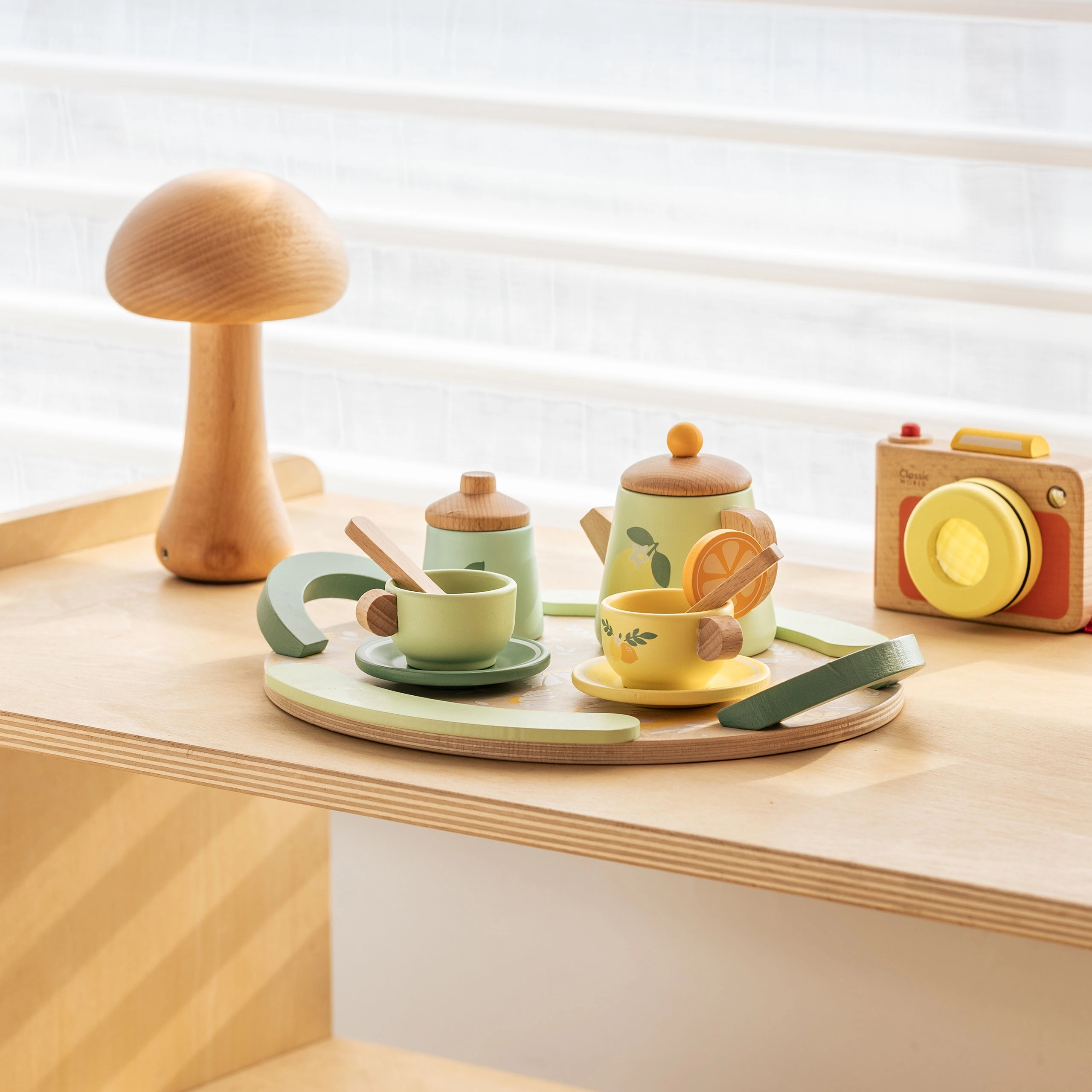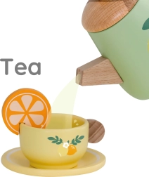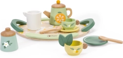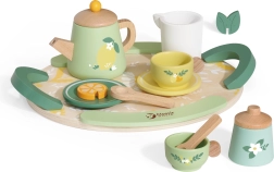 Uzdāviniet bērniem apburošu tējas rituālu ar elegantu koka komplektu maigos pasteļtoņos. Komplektu rotā augļu un ziedu motīvi, un tajā ietilpst kanniņa, tasītes ar apakštasītēm, karotītes, piena un cukura trauciņi, kā arī liela paplāte ar rokturiem ērtai pārnēsāšanai.