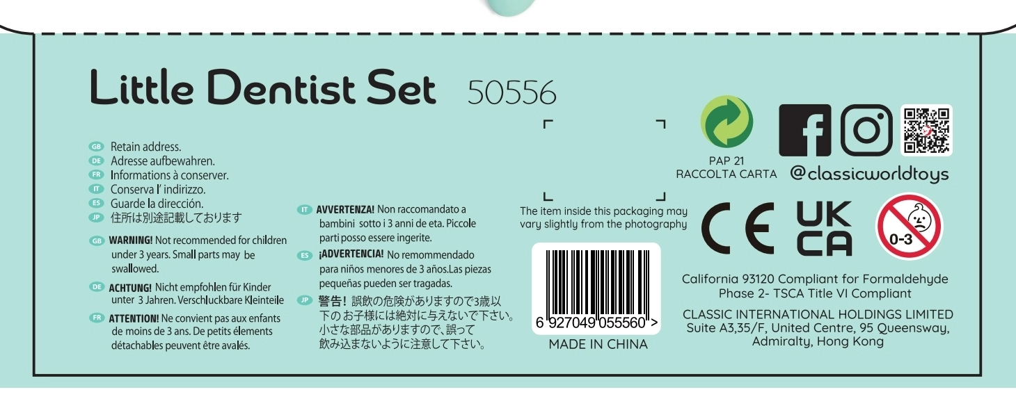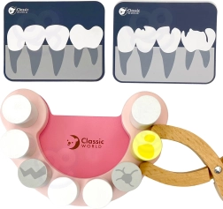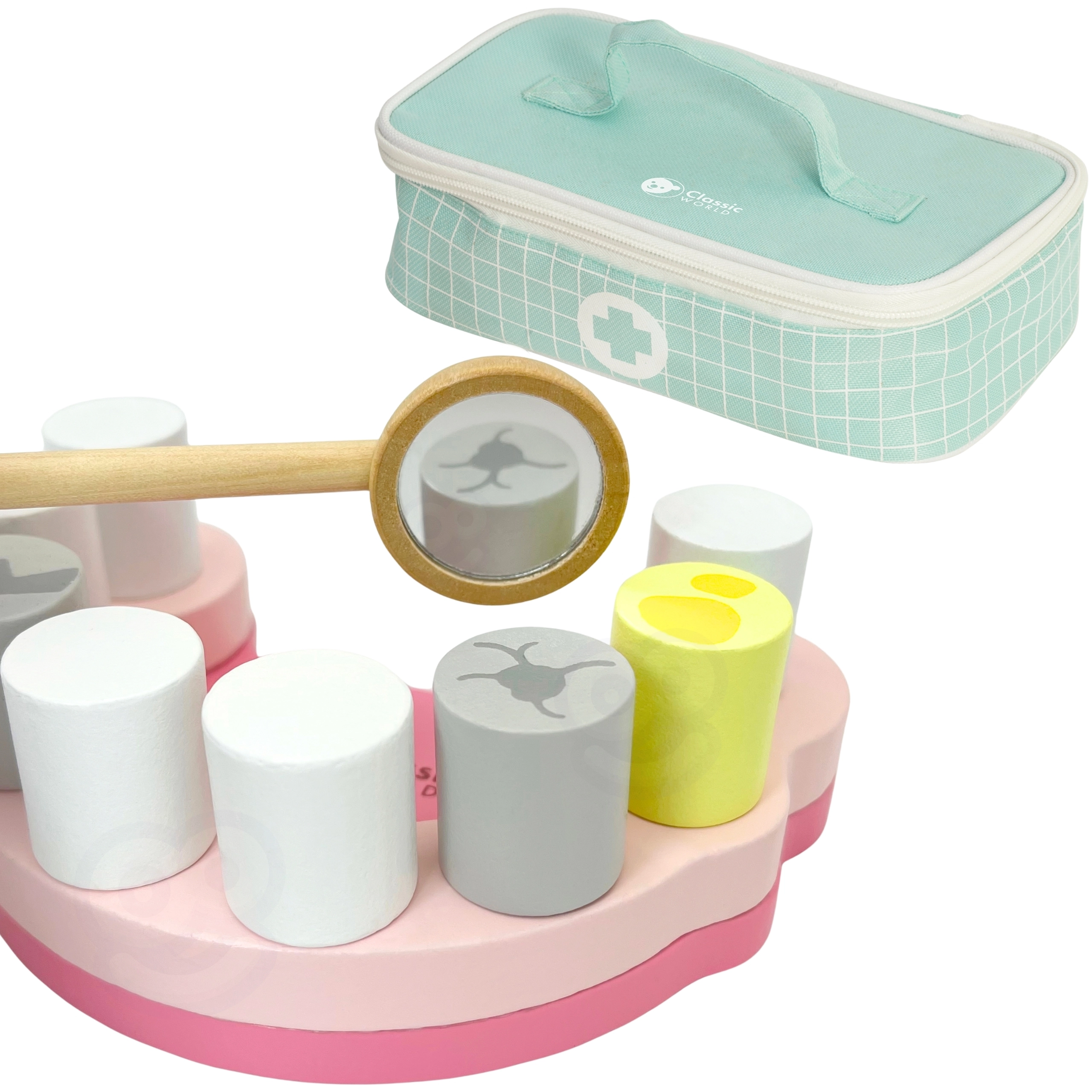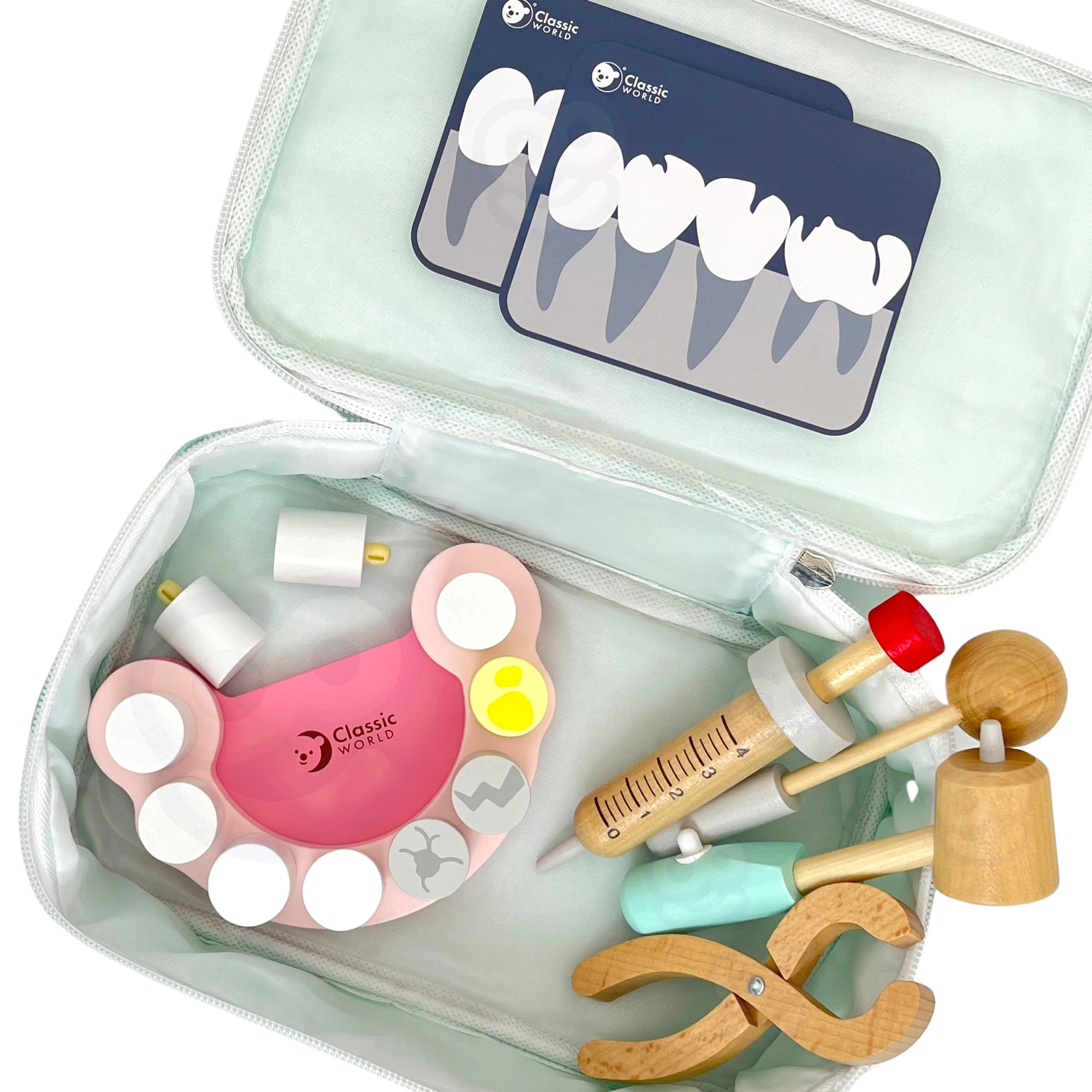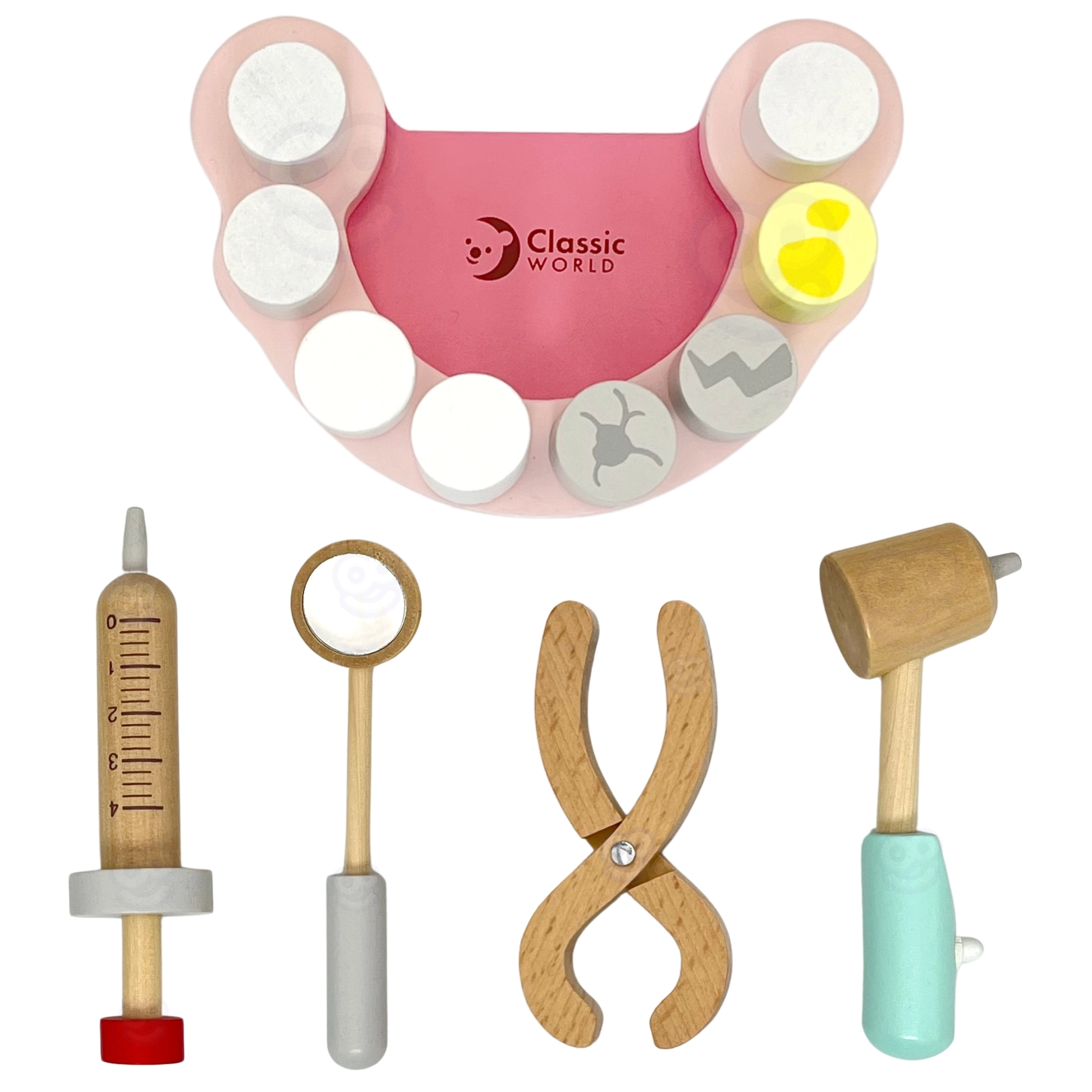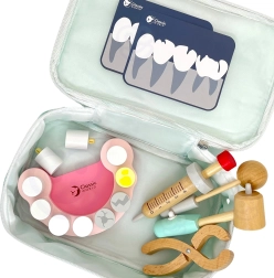 Classic World mazā zobārsta komplekts bērniem piedāvā drošu vidi stomatoloģijas pasaules iepazīšanai. Pateicoties reālistiskiem koka instrumentiem un smaganu modelim, bērni iemācās, kā notiek pārbaude, kāpēc zobu kopšana ir svarīga un kas notiek, ja higiēna tiek atstāta novārtā. Spēle dabiski stiprina komunikācijas prasmes un pārliecību.