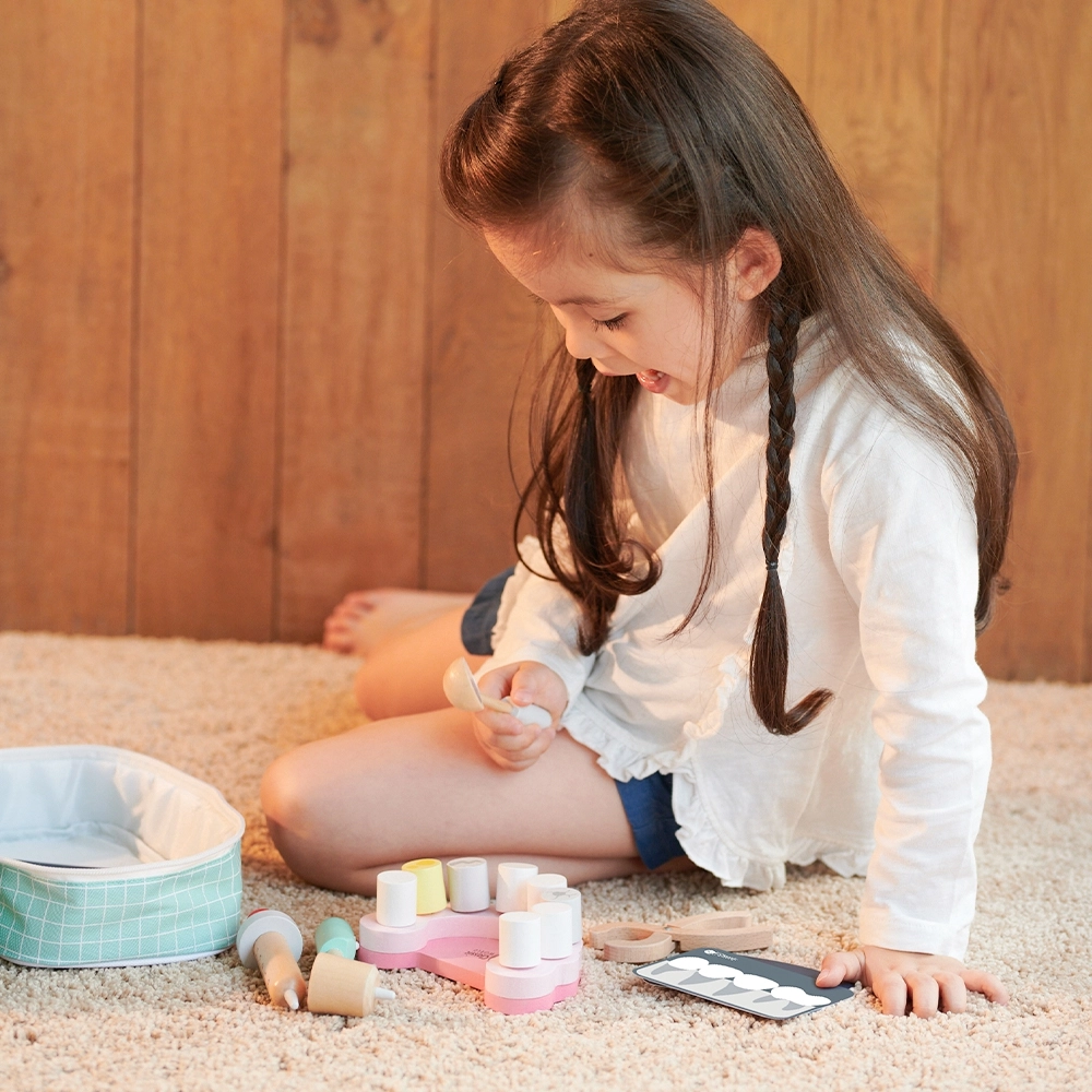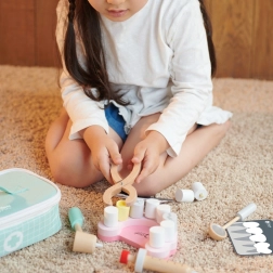 Premium izpildījums no dabiska koka nodrošina izturību un ilgmūžību. Praktiskais koferītis uztur visas detaļas kopā, padarot komplektu ideāli piemērotu arī ceļošanai. Pateicoties pievilcīgam dizainam maigos toņos, tas ir lieliska dāvana bērniem no 3 gadu vecuma.
