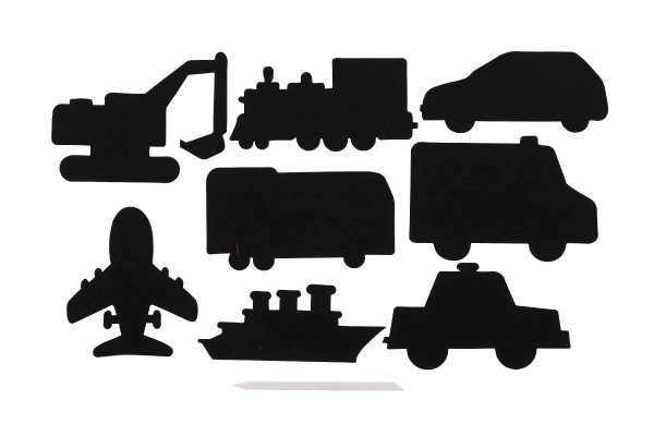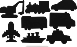 Komplektā ietilpst 8 dažādi kasāmo dizainu motīvi, tostarp lidmašīna, automobilis, vilciens un citi.