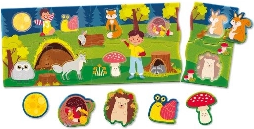 - Puzzle satur krāsainus meža attēlus, kas iedvesmo un stimulē bērnu iztēli.