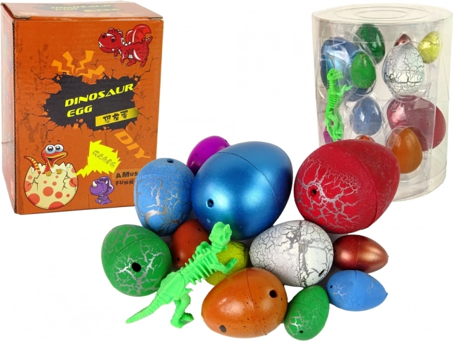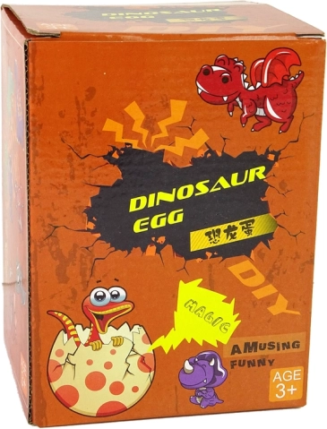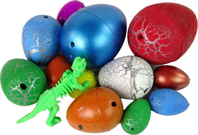 Iepakojumā atradīsiet 12 gab. olu dažādās krāsās, rakstos un izmēros (no apm. 3 × 2 cm līdz 6 × 4,5 cm) un papildus zaļu dinozaura “skeletu” 6 cm garumā. Viss ievietots ērtā plastmasas tūbā un dāvanas iepakojumā.